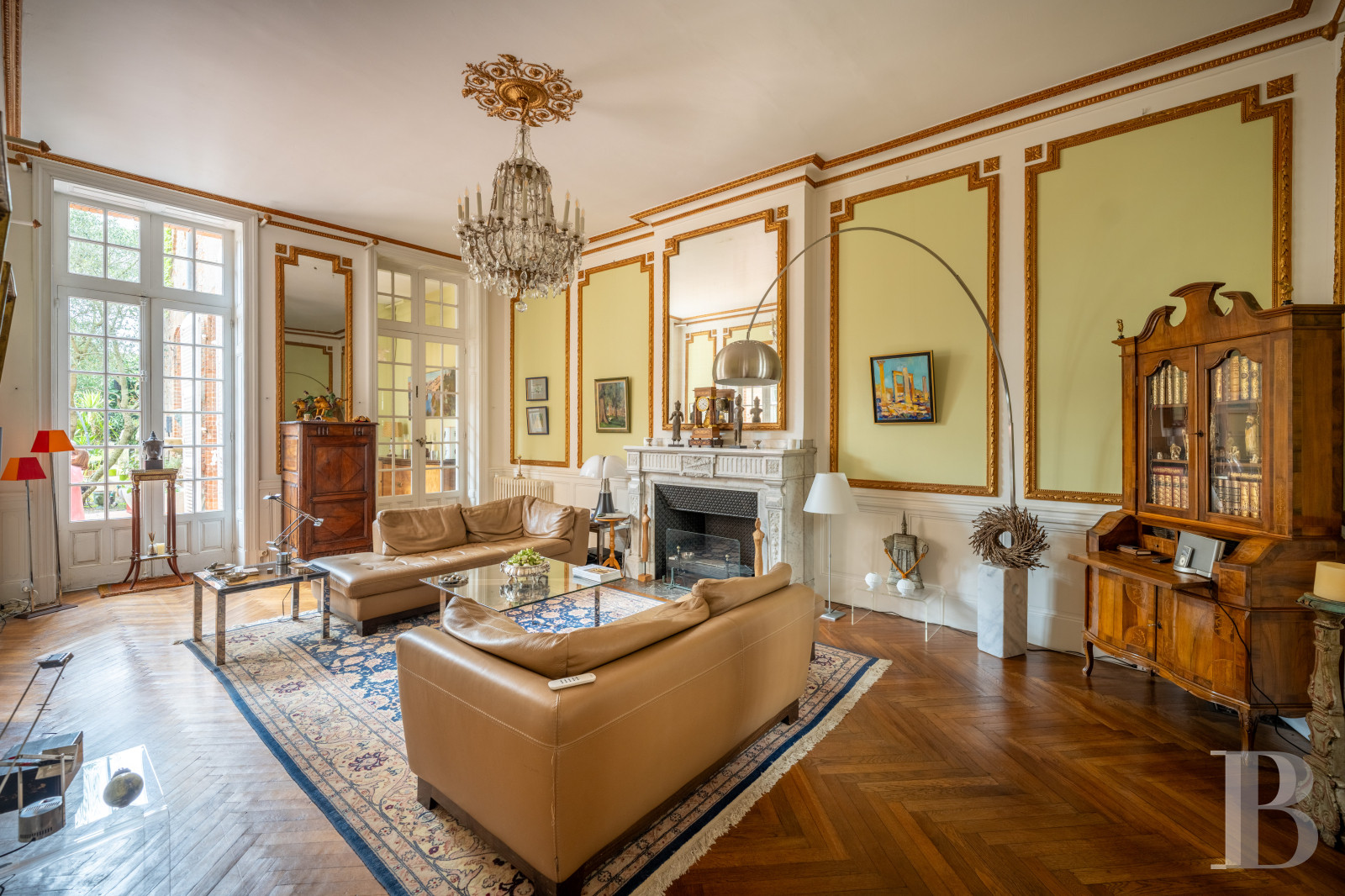 Several entrance doors lead inside. One is in the facade and others can be reached once you have gone through the wrought-iron gate that takes you into the inner court. The most noble door among them leads into a hallway with white wooden panelling and a floor of cement tiles. This hall connects to the main rooms on the ground floor. There are two other doors as well: one leads to the kitchen and the other to a wooden hallway that looks out at the town square. You can reach the reception room straight from the street. It has a seven-metre ceiling height. It features a French-style beamed ceiling, a gallery and a monumental fireplace made of brick. Beside it there is a dining room with Versailles parquet in a cosier section. An adjoining corridor fitted with two old built-in cupboards subtly connects to service rooms. A second lounge faces the inner court. It has a marble fireplace, herringbone parquet, wooden panelling with mouldings and a golden ceiling rose. The contemporary kitchen, which leads out onto the terrace, is extended with a pantry and scullery. A lavatory, a utility room and a music room complete this level. From the corridor, a flight of stairs leads down to vaulted cellars, which offer 200m² of extra floor area with technical installations rooms and a former well.