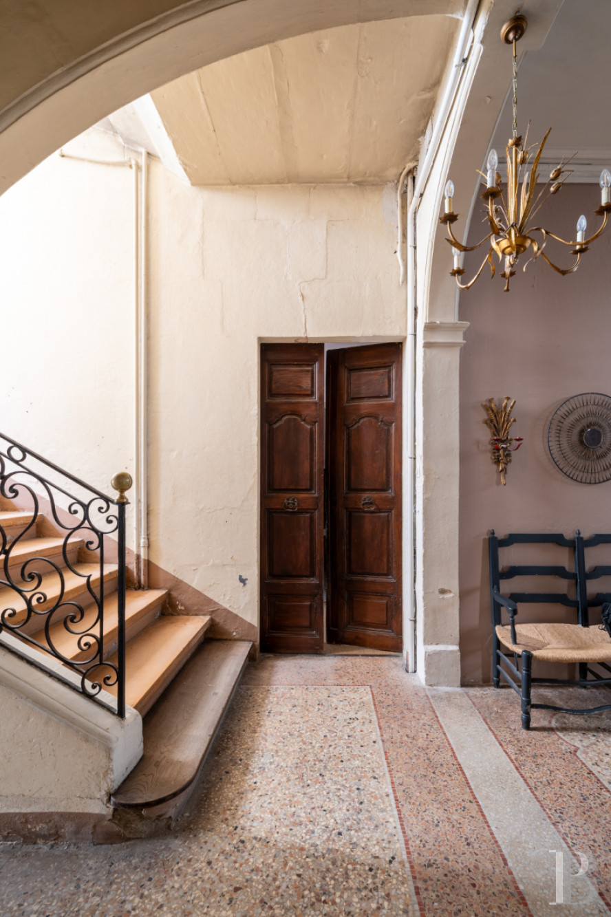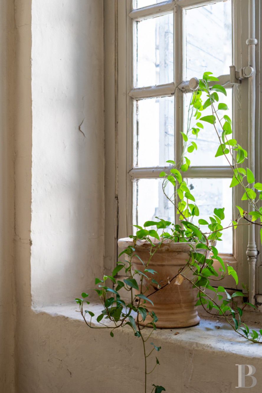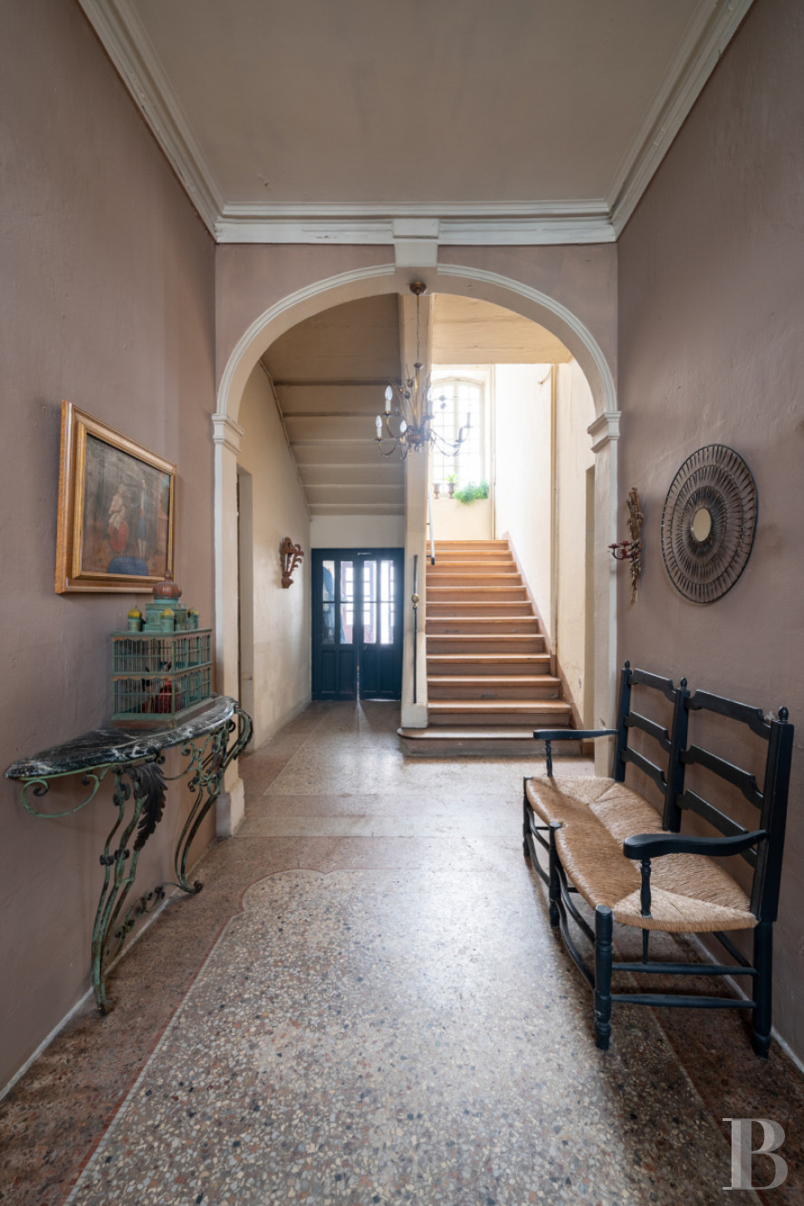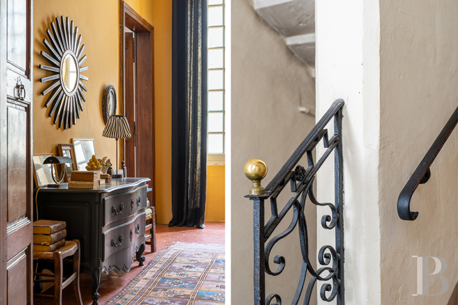 As for the series of polished oak double doors, they create the dwelling’s decorative leitmotif on every floor and vertically cadence the warm, uniform colours of its walls, whereas, under the staircase’s vault, two tall small-paned windows bathe its Barbentane stone steps in abundant sunlight, the latter of which are safeguarded by a wrought-iron bannister. Last, but not least, towards the back of the entrance hall, a door opens on to the rear courtyard as well as a garage whose door gives on to the adjacent street.