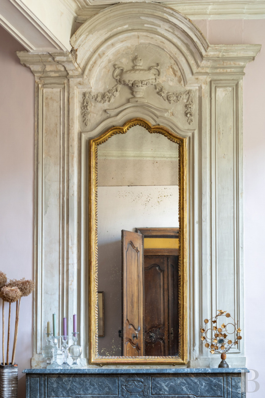 At apéro hour, the setting sun’s last light warmly grazes the kitchen’s glass door and a series of steps that lead to the patio, while the adjacent dining room provides access to the living room and a study whose original hexagonal terracotta floor tiles gleam with faded footsteps. As for the living room’s fireplace, it features a mirror topped with a bas-relief of a ceremonial cup flanked by flowering garlands as well as two symmetrical niches on ether side, one of which is clad in diagonal-shaped panelling decorated with moulded scrollwork typical of the French Rococo style.