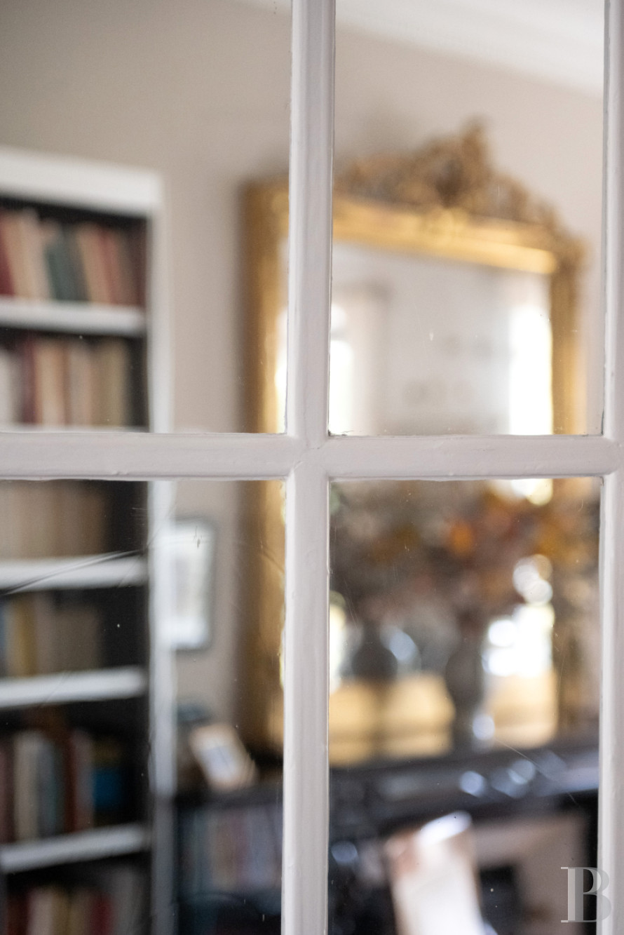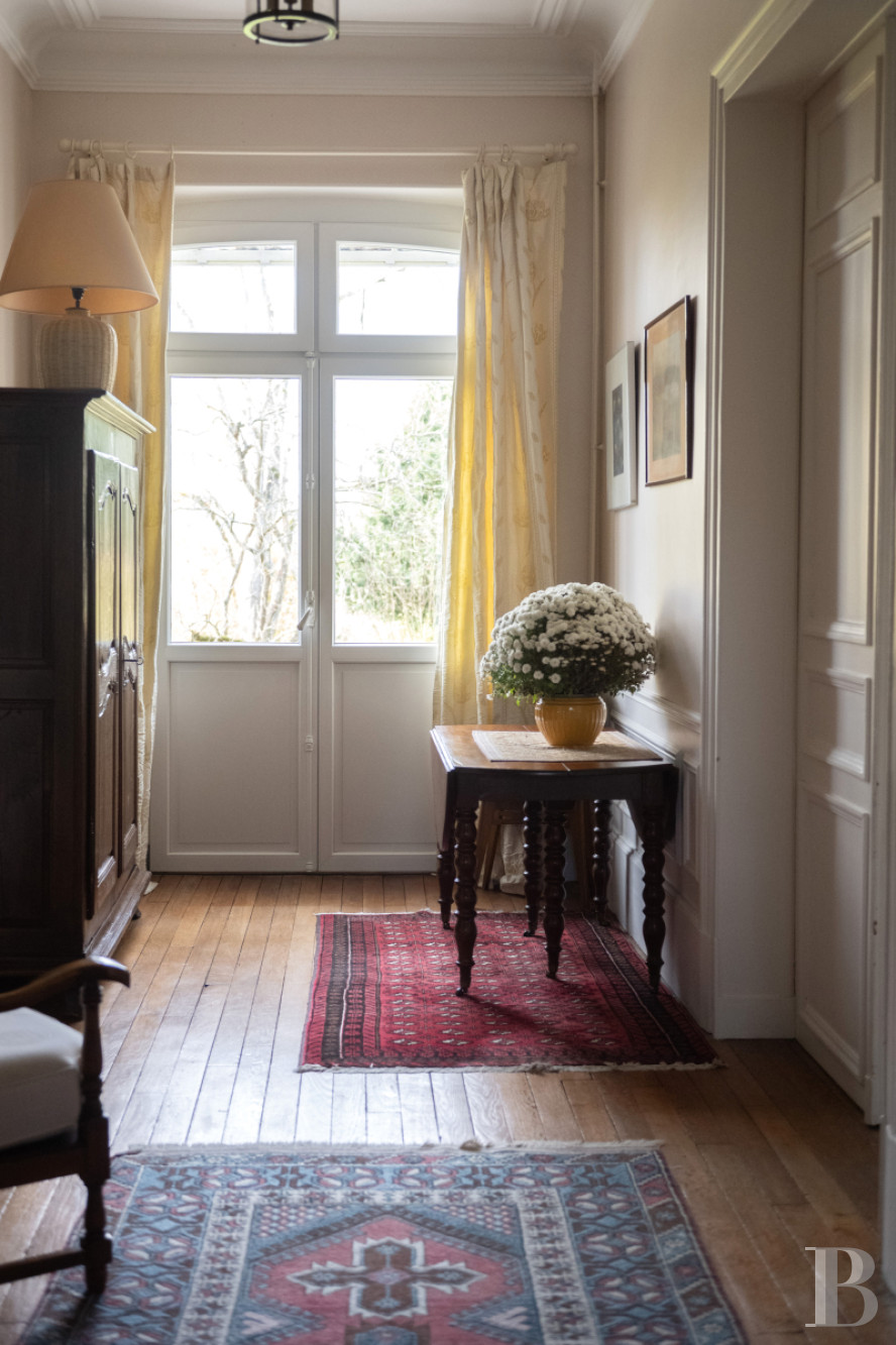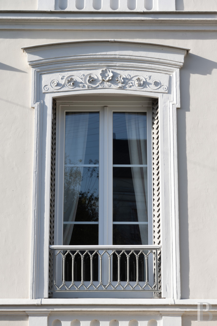 Built around 1850, the three-storey dwelling is topped with a tile roof and features a classical architectural vocabulary with its pilaster-like quoins, rectangular glass awning, cornice decorated with modillions as well as windows topped with an antique-style frieze adorned with stylised floral patterns. As for the back of the house, majestic stone steps provide access to an immense garden, while the windows, still protected by shutters, have no decorative friezes, giving this side of the dwelling a more understated, but still elegant appearance.