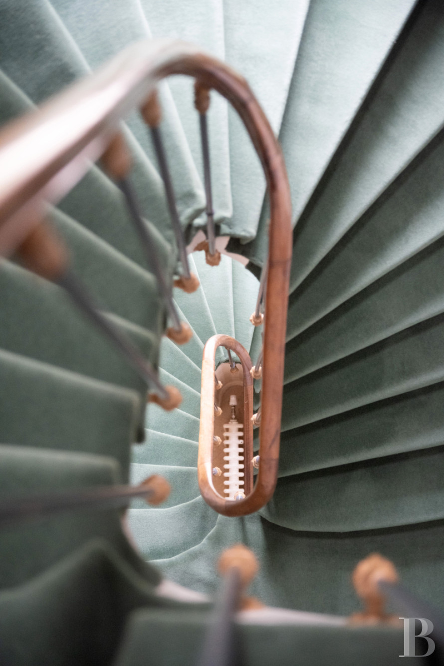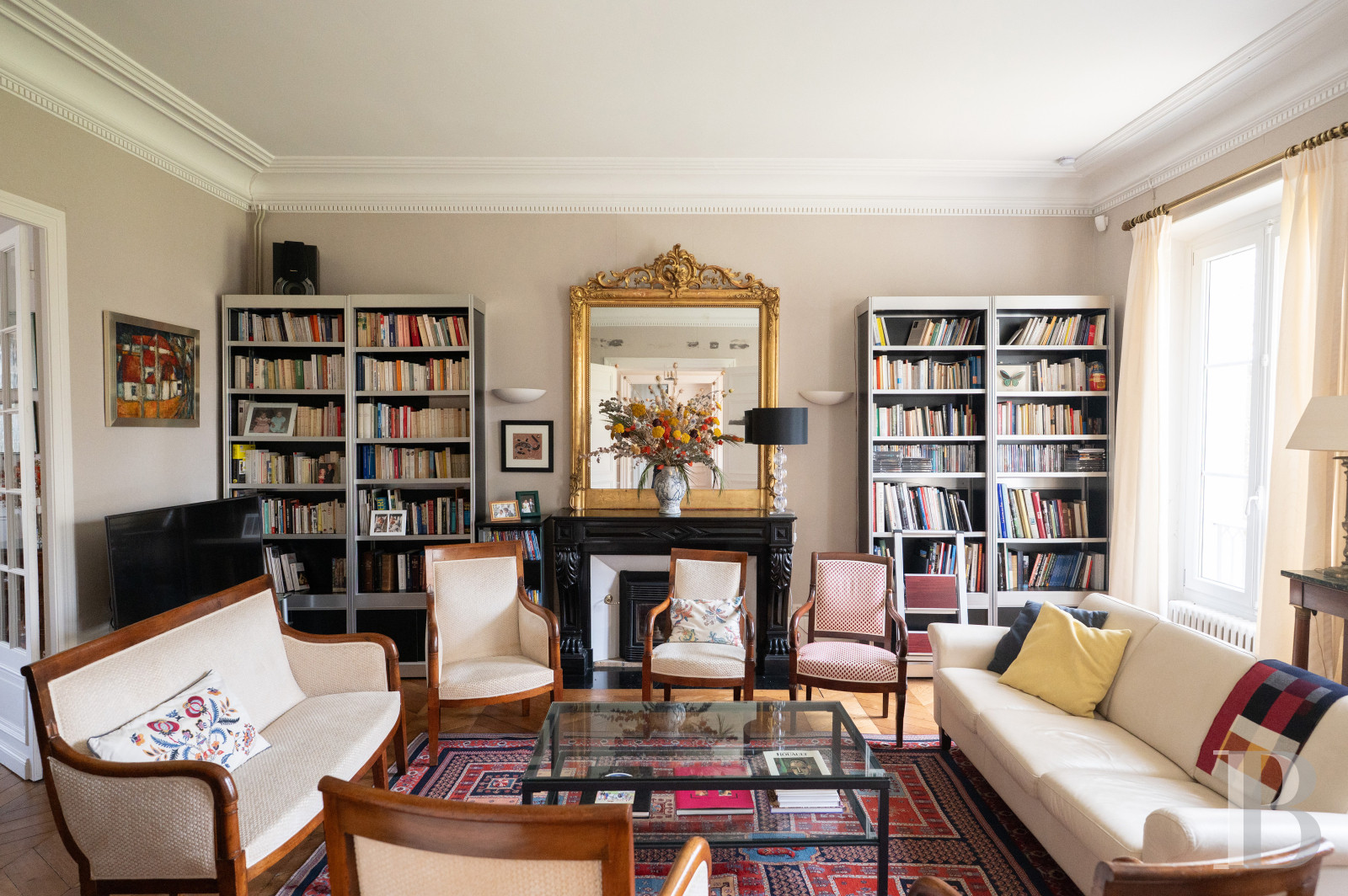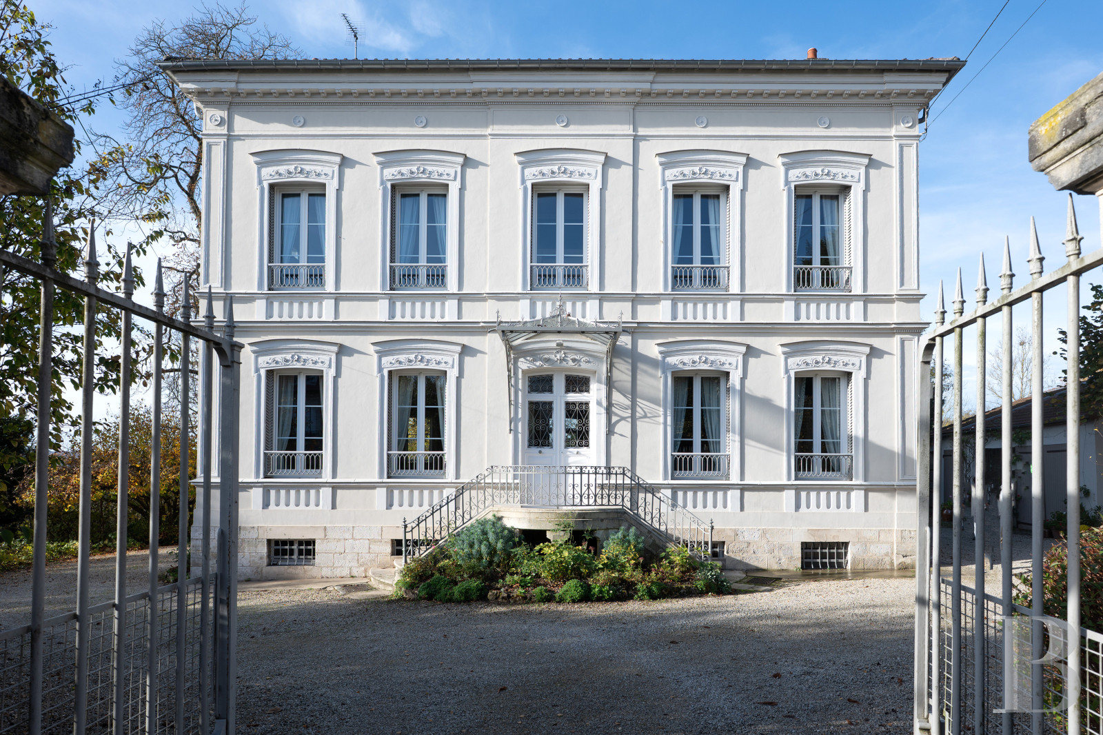 Built around 1850, the three-storey dwelling is topped with a tile roof and features a classical architectural vocabulary with its pilaster-like quoins, rectangular glass awning, cornice decorated with modillions as well as windows topped with an antique-style frieze adorned with stylised floral patterns. As for the back of the house, majestic stone steps provide access to an immense garden, while the windows, still protected by shutters, have no decorative friezes, giving this side of the dwelling a more understated, but still elegant appearance.