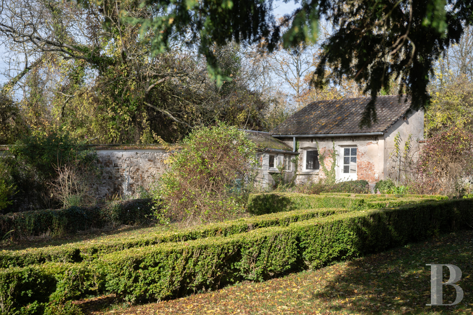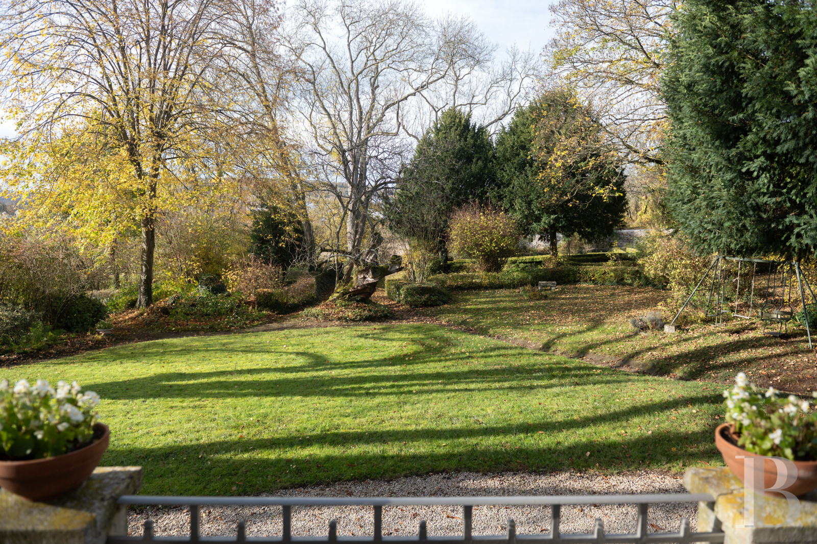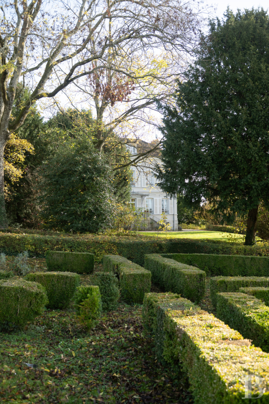 Fortunately, it has preserved its 19th-century physiognomy: tall trees, a lawn facing the dwelling, box tree-lined pathways leading to the former vegetable garden and stone walls festooned with climbing roses, while, in the back, a small gardener’s cottage abuts the enclosure wall and a small stream provides the garden with a refreshing source of water in the summer.