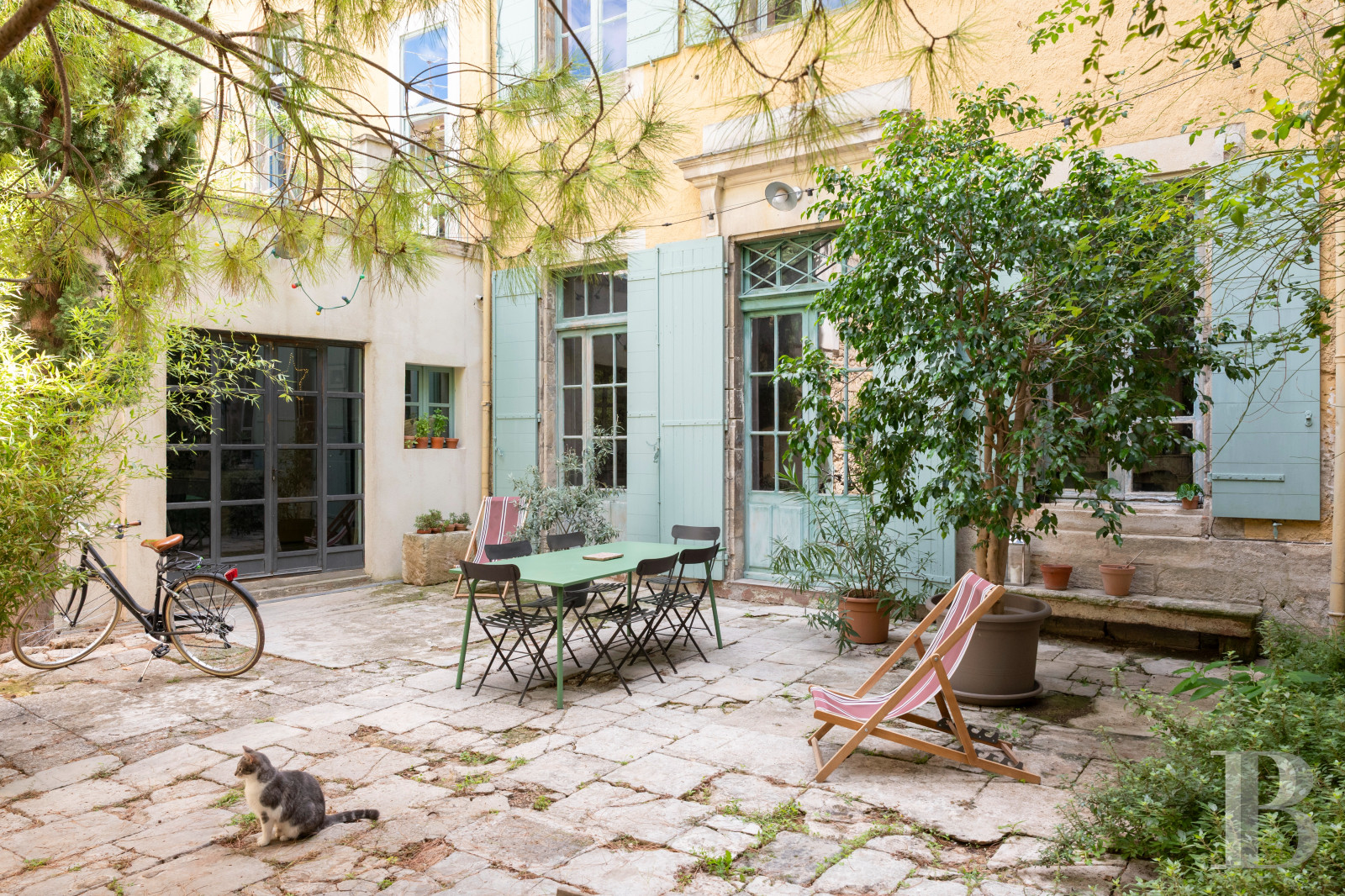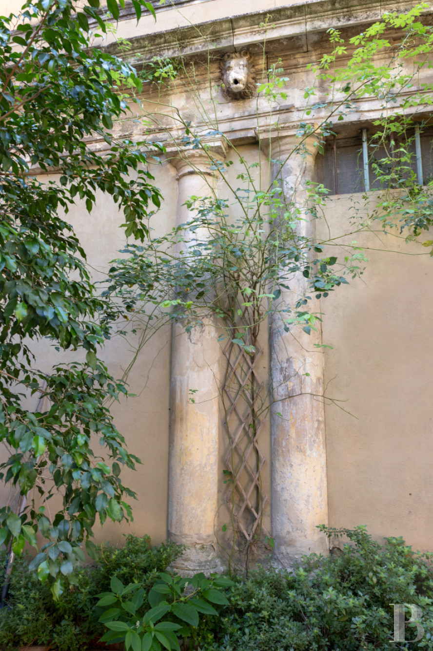 A paved court with Beaucaire stone slabs covers around 100m², enclosed in the building’s L shape. This court is a delightful space with true character. It is north-facing, yet it is bathed in much sunlight from spring to early autumn while remaining pleasantly cool. It stands out for its columns and gargoyles from the 17th century, which are doubtless remnants of a renowned edifice. Indeed, such a practice was widespread among prominent citizens seeking splendour. Trees and shrubs of different varieties dot the court, which leads to the kitchen, the lounge and a ground-floor bedroom. An age-old cypress, a maritime pine, bamboo and various pot plants form a calm backdrop that recalls the countryside.