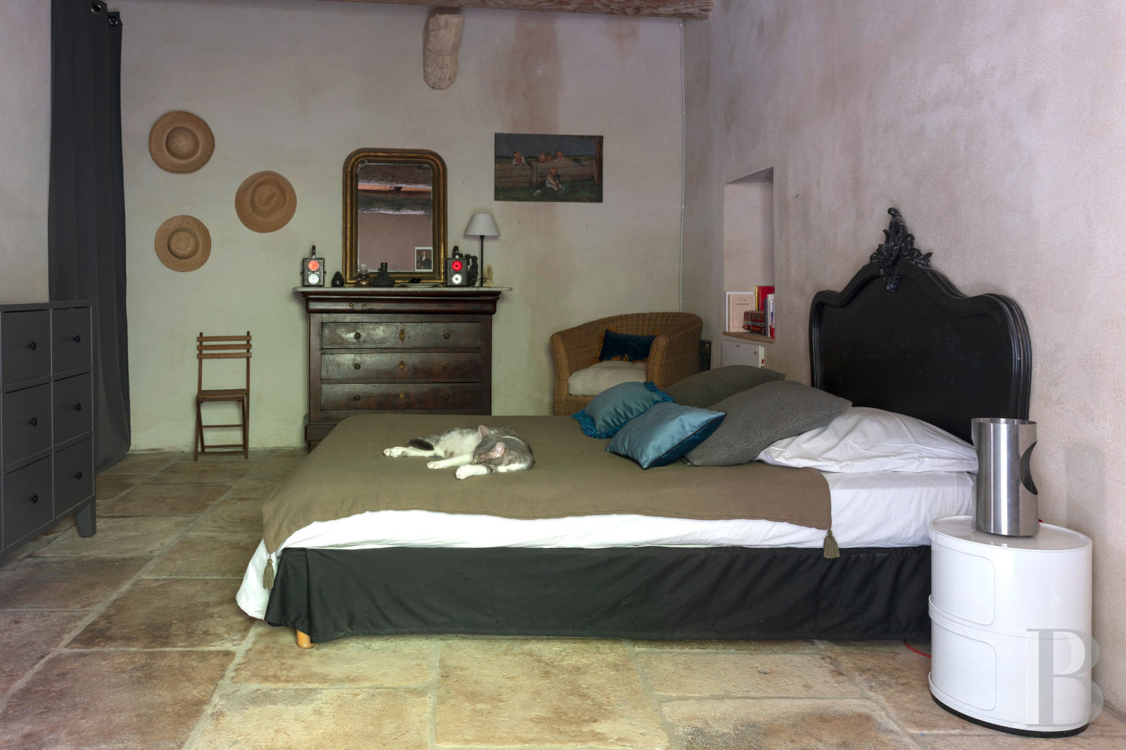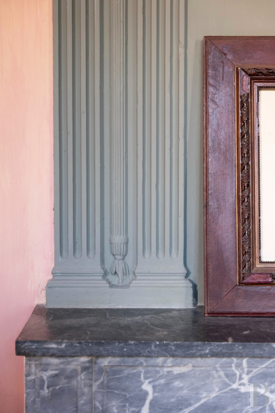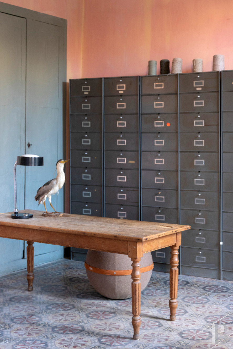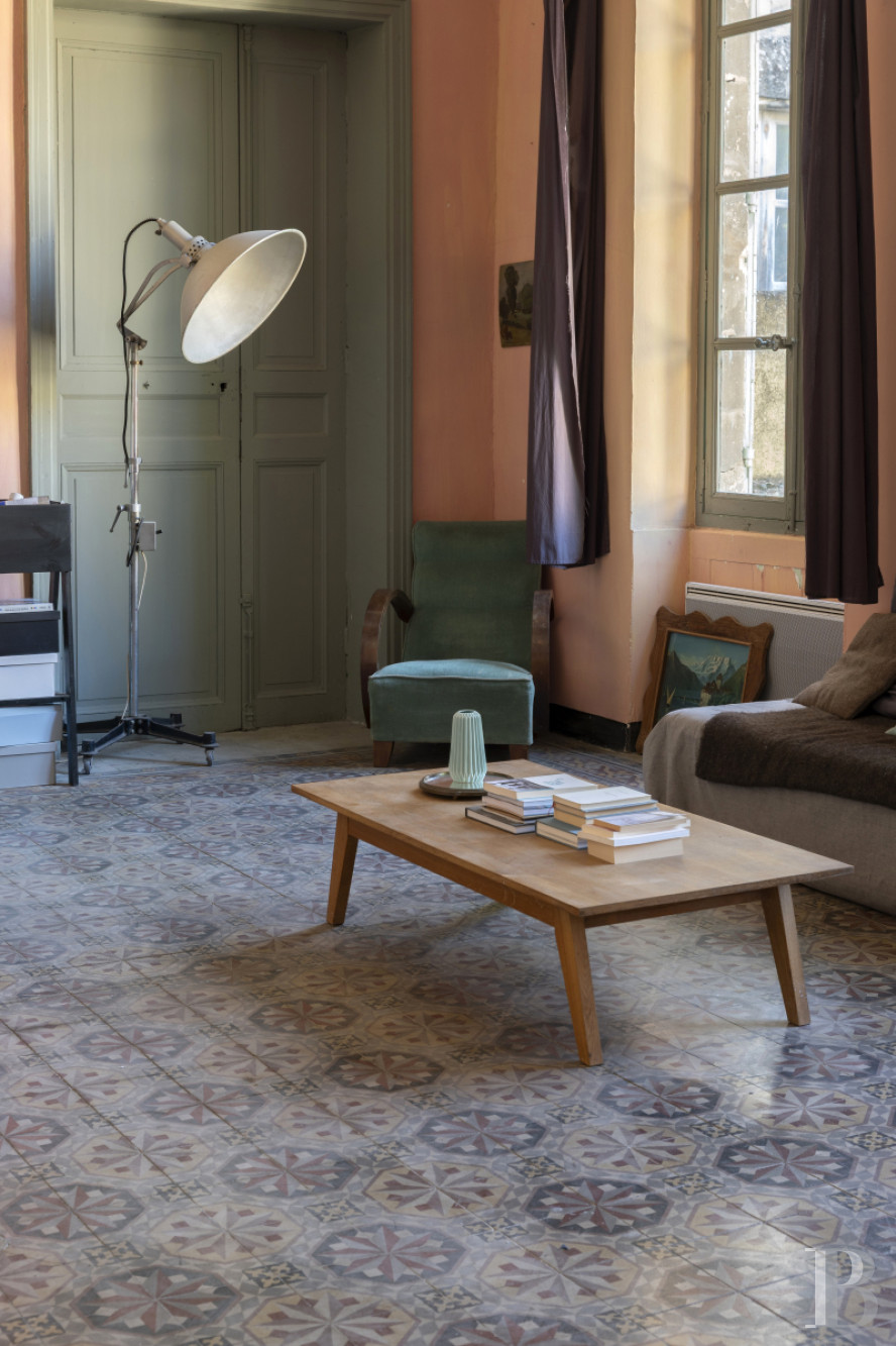 There is a second lounge on the first floor. It has the same proportions as the reception room below it and it looks down at the court through three tall windows. Its floor of cement tiles, which dates back to the 19th century, has a patina of age. The lime-coated walls are rose in colour and the window frames are of a tasteful green hue. A central fireplace of grey marble stands between built-in cupboards. This room could easily be turned into a fourth bedroom with an adjoining bathroom, given that the water inlets are still in place. The landing connects to a lavatory and then to a second bedroom that is remarkably spacious and high-ceilinged. This bedroom is bathed in an abundance of natural light from a roof window, a tall window and a glazed door that leads out to the terrace. Its pale-blue walls, its terracotta floor and its bookshelves covering the whole of one wall form a delightful decor. The bedroom also has its own shower room and a mezzanine that you can reach via a plain wooden staircase. Lastly, from the terrace, you can reach a third bedroom, which has a two-slope ceiling. It combines a smooth concrete floor with natural-toned walls. It is a triple-aspect space, so it is constantly bathed in natural light. It also has its own shower room and lavatory, making it self-contained.