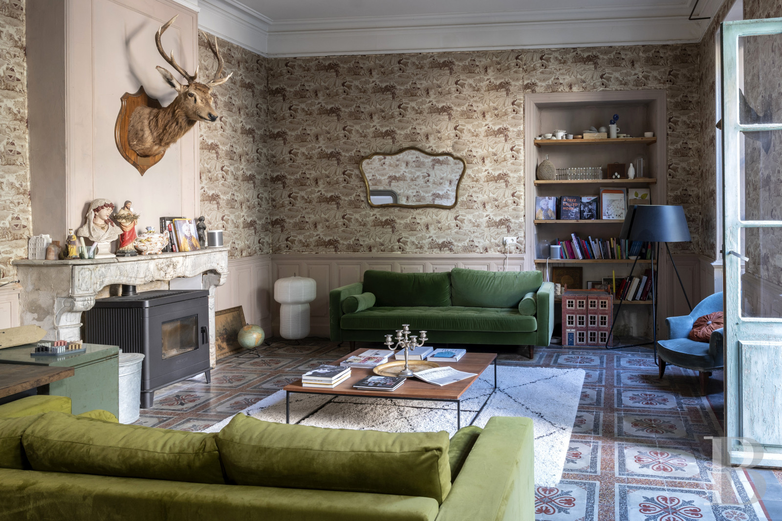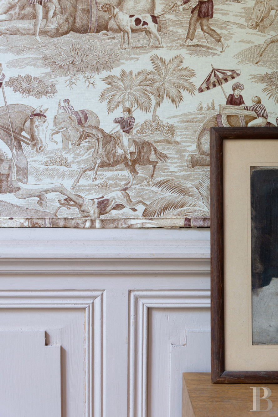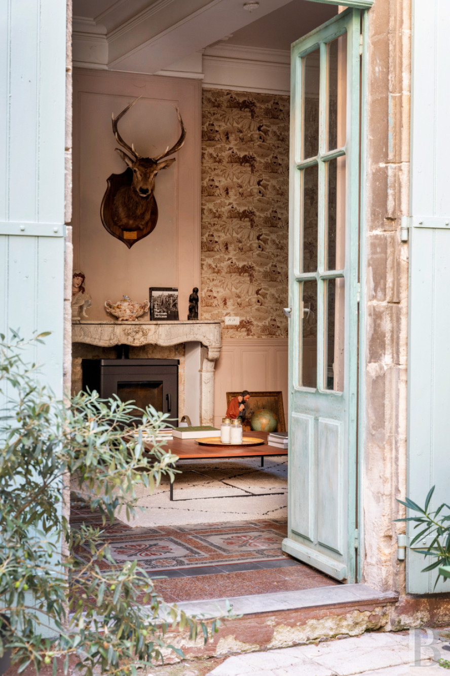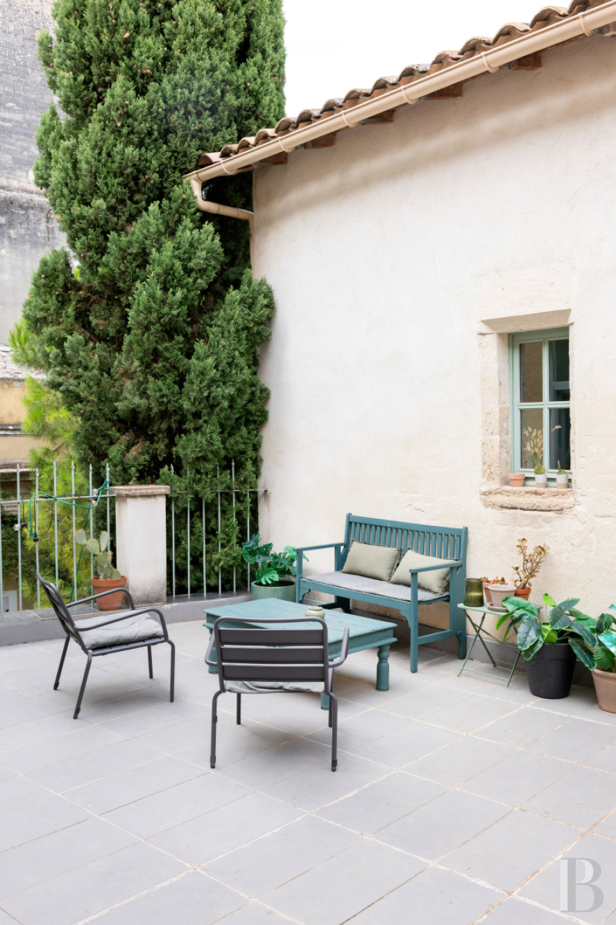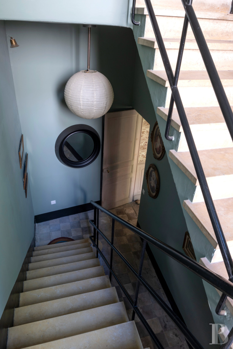 Beneath whitened ceiling beams, the kitchen, which is the heart of the home, has a floor of large, old terracotta tiles, work surfaces of white tiles and walls painted pale blue. The room is bathed in natural light from broad, metal-framed French windows, which bring out its spaciousness. From here, a hallway with a floor of old cement tiles leads to a lavatory, a staircase and a lounge. The lounge leads out to the courtyard via tall French windows. It is well proportioned and it has a rare kind of 19th-century floor that combines terrazzo with polychromatic squares. It also has toile de Jouy wallpaper with Orientalist motifs and a marble fireplace. From the kitchen, you can also reach the ground-floor bedroom. It has exposed beams and a floor of Beaucaire stone with a patina of age. It leads out to the courtyard and has a shower room and a storage space. Lastly, a travertine staircase with a wrought-iron balustrade and light-green lime-coated walls leads up to the terrace and first floor.