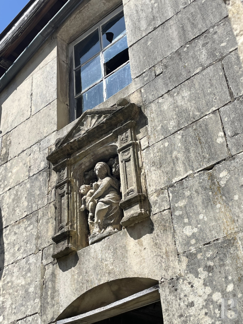The wing at right angles features a sculpted recess with pediment and pilasters and a statue of the Virgin and Child, probably dating from the 16th century.