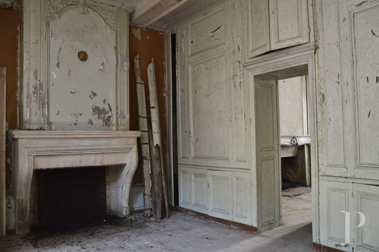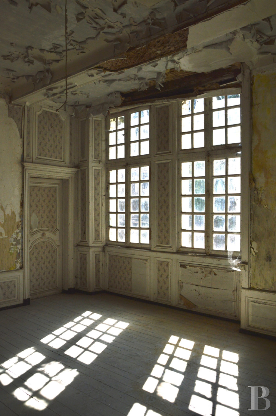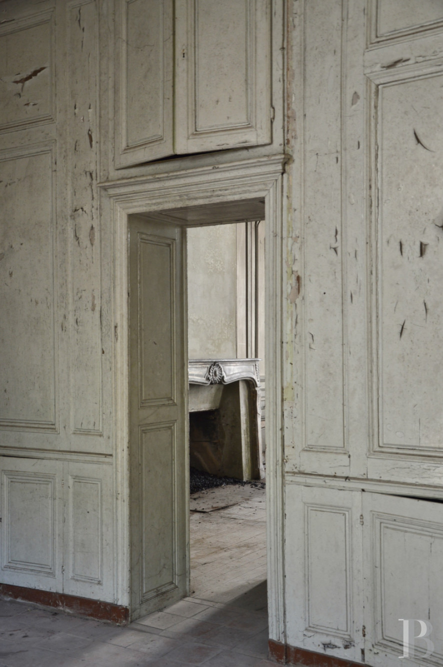 The spiral staircase leading to the first floor is located in the lodge at right angles. The landing serves four rooms separated by a central hall. The first, with a simple painted stone fireplace, has a panelled wall and a door opening into a bedroom with an alcove and an 18th century fireplace with an overmantel. Above the Louis XV door leading to the central hall, there is a depiction of a figurative scene inspired by Greek mythology with a goddess presenting a young god to an assembly on an Olympian landscape. The following hall is full-depth, with French windows at either end opening onto small balconies. An alcove bedroom with a wooden fireplace and its 18th century overmantel adorned with volutes is followed by a second, simpler bedroom. This connects to the wing at right angles to the landing of the back staircase before reaching a final bedroom with a 17th century stone fireplace.