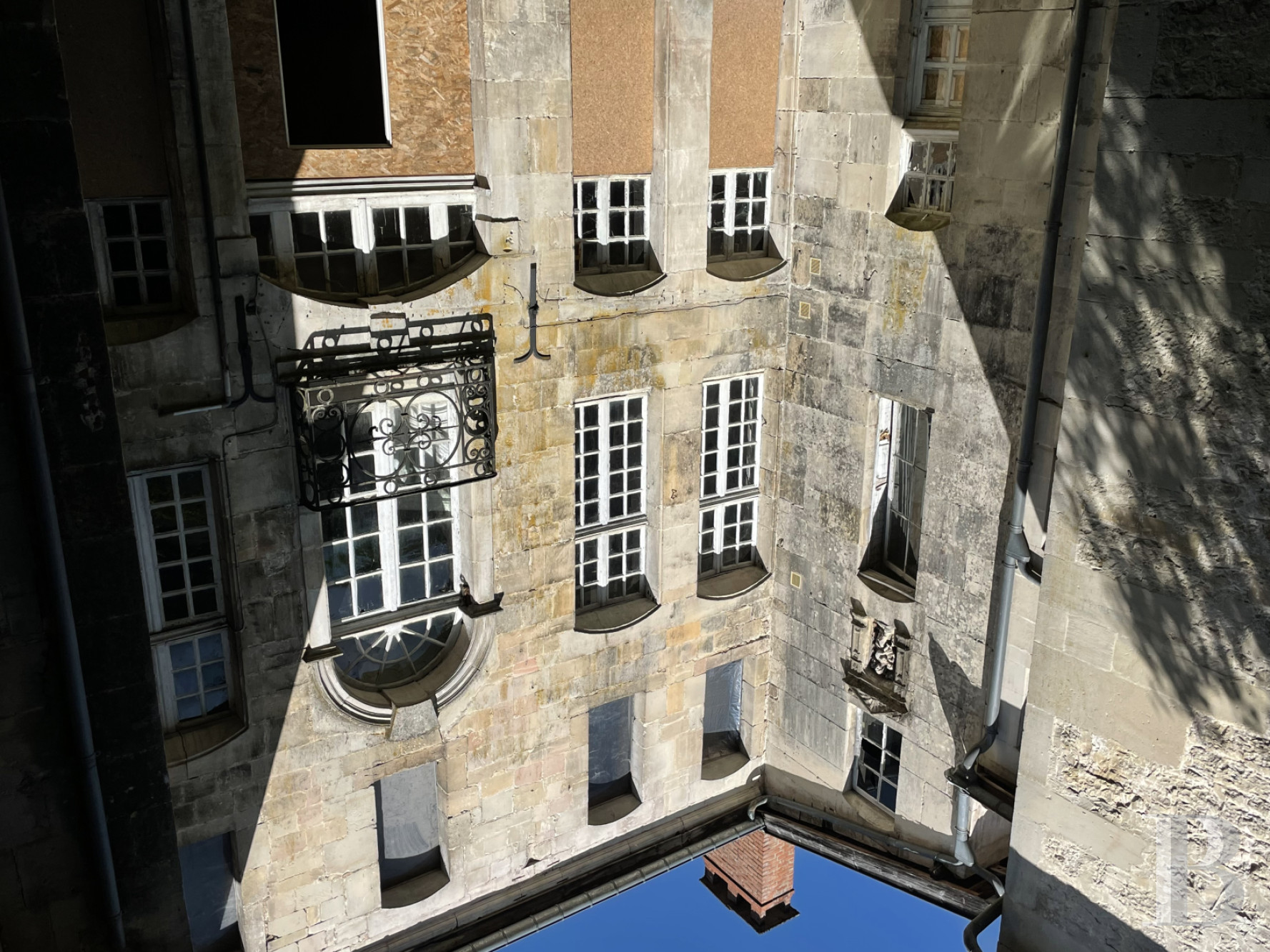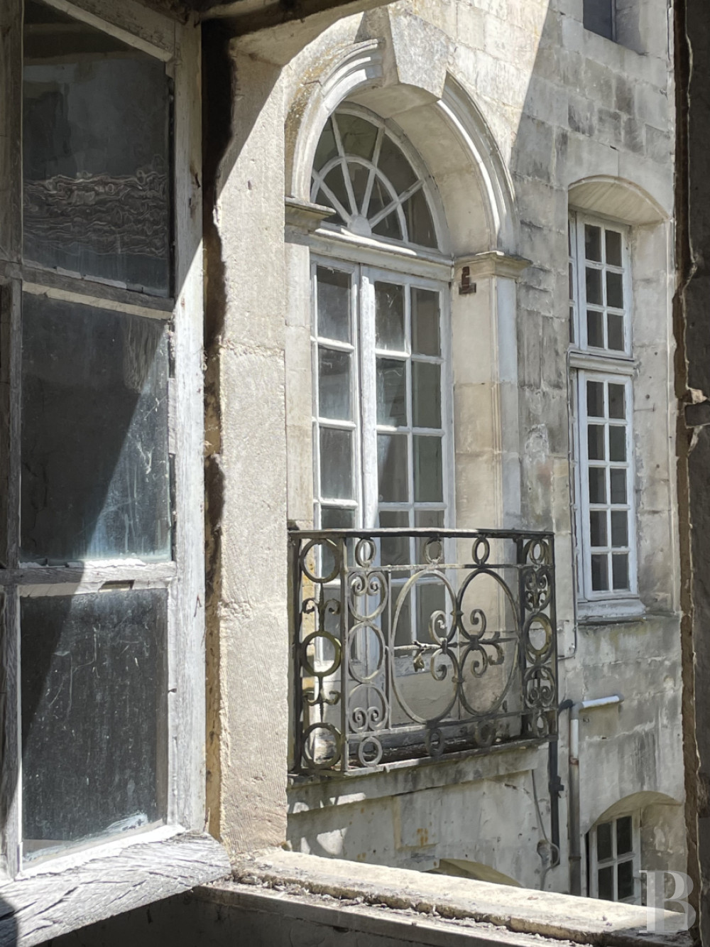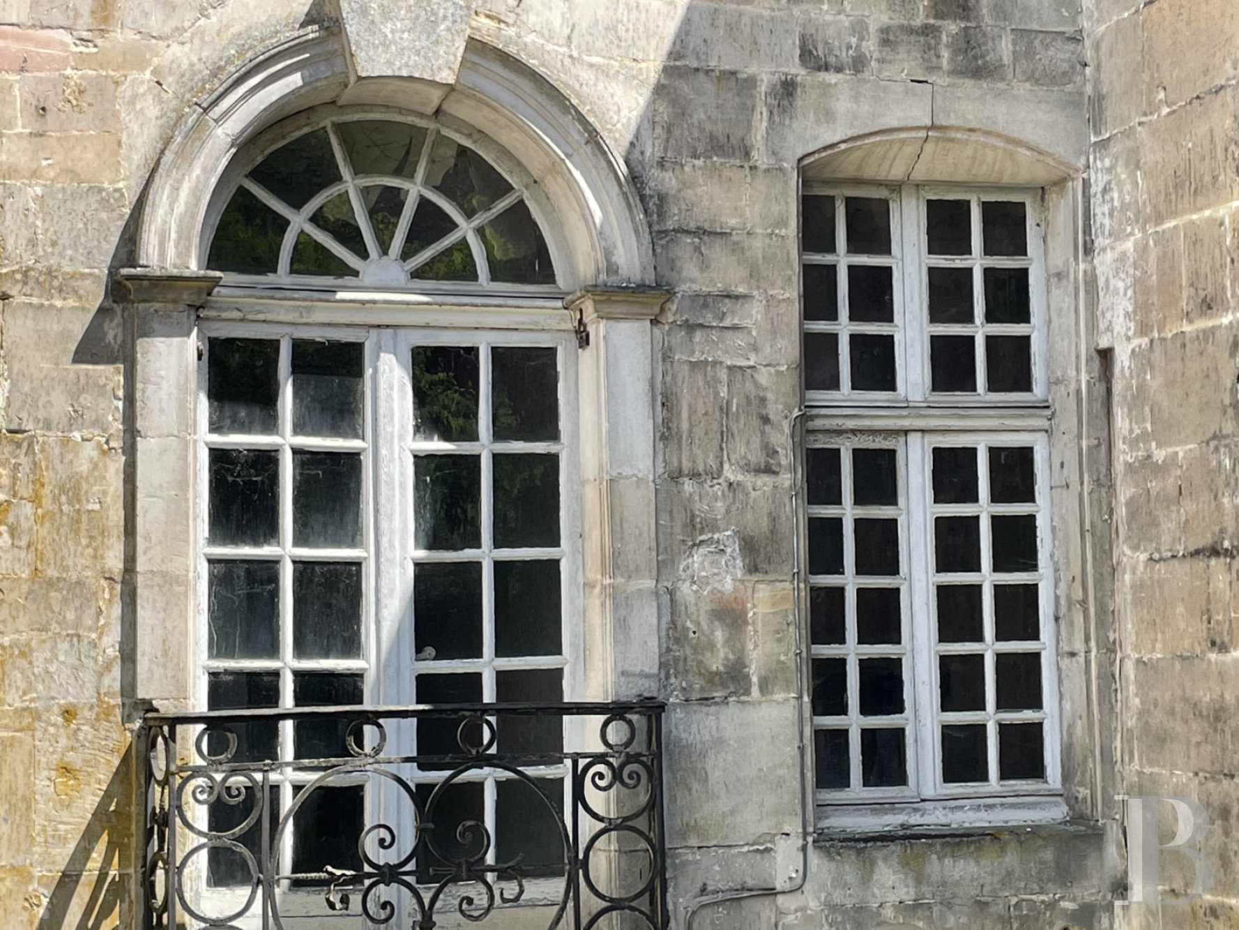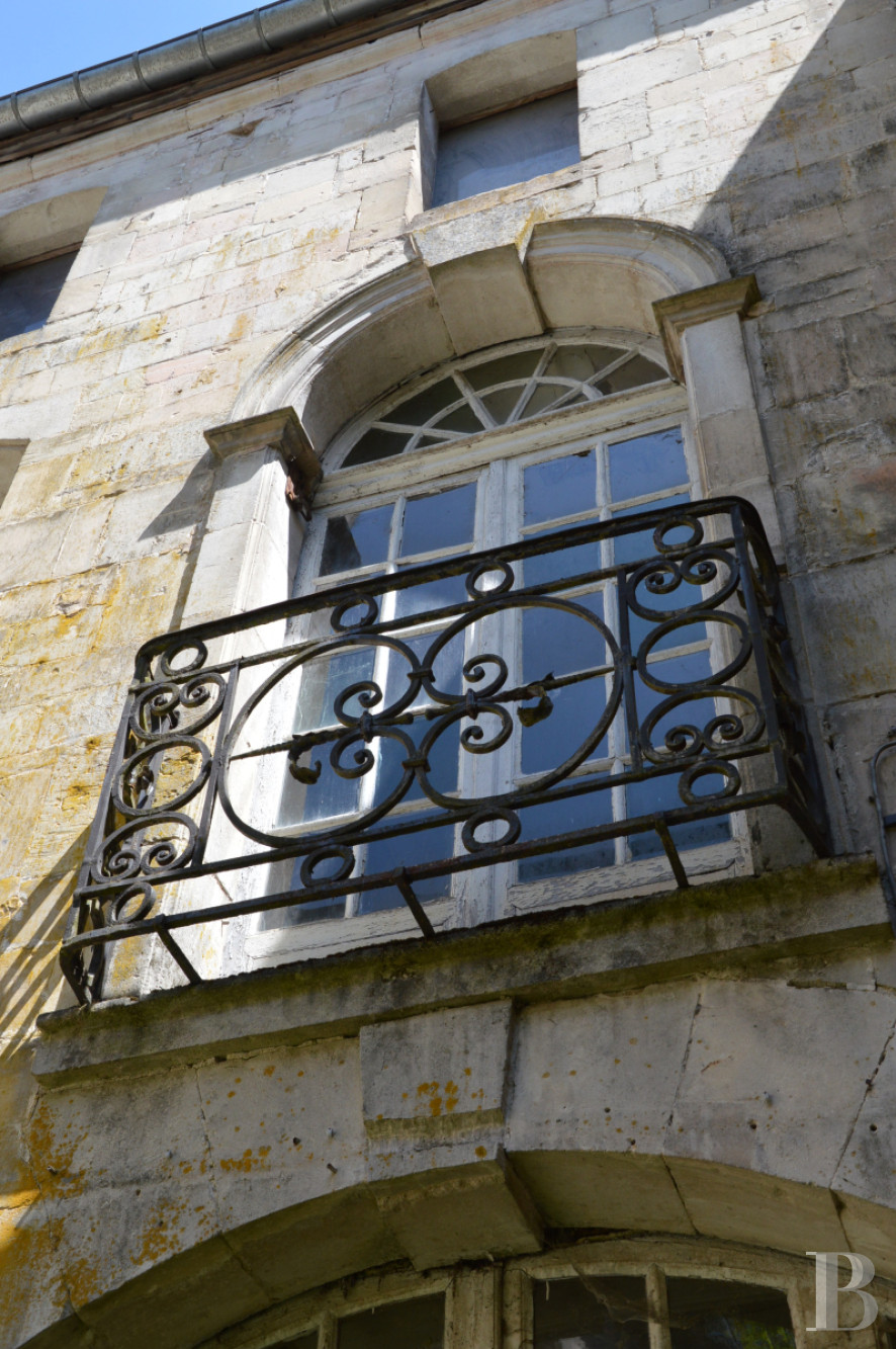 The round-arched windows are crowned with decorative carved stone features. On the first floor, the windows are framed by pilasters and adorned with wrought-iron balustrades. The central balcony bears the initial of one of its illustrious 18th century inhabitants.