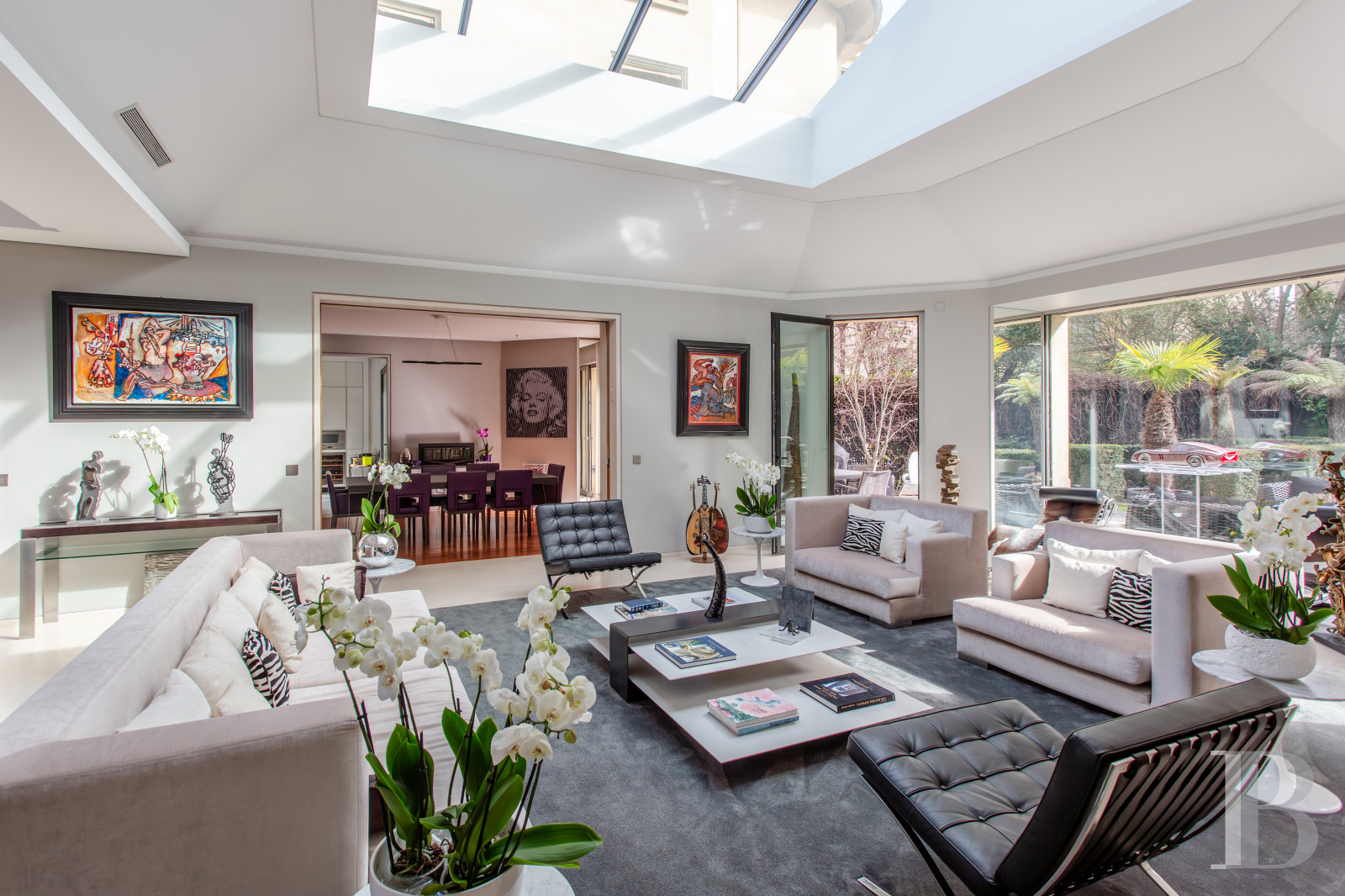 The personal home of the architect Jean Walter has a floor area of almost 425 m² and an outdoor space of around 450 m². Several reception rooms bathed in light open onto patios and a garden. The night-time area comprises two bedrooms, an independent flat and a study. There is also a relaxation zone including an 11-metre swimming pool, a spa, a steam room and a gym. The architectural style is bold yet sober, and the choice of materials refined: dressed stone, travertine, mahogany and marble.