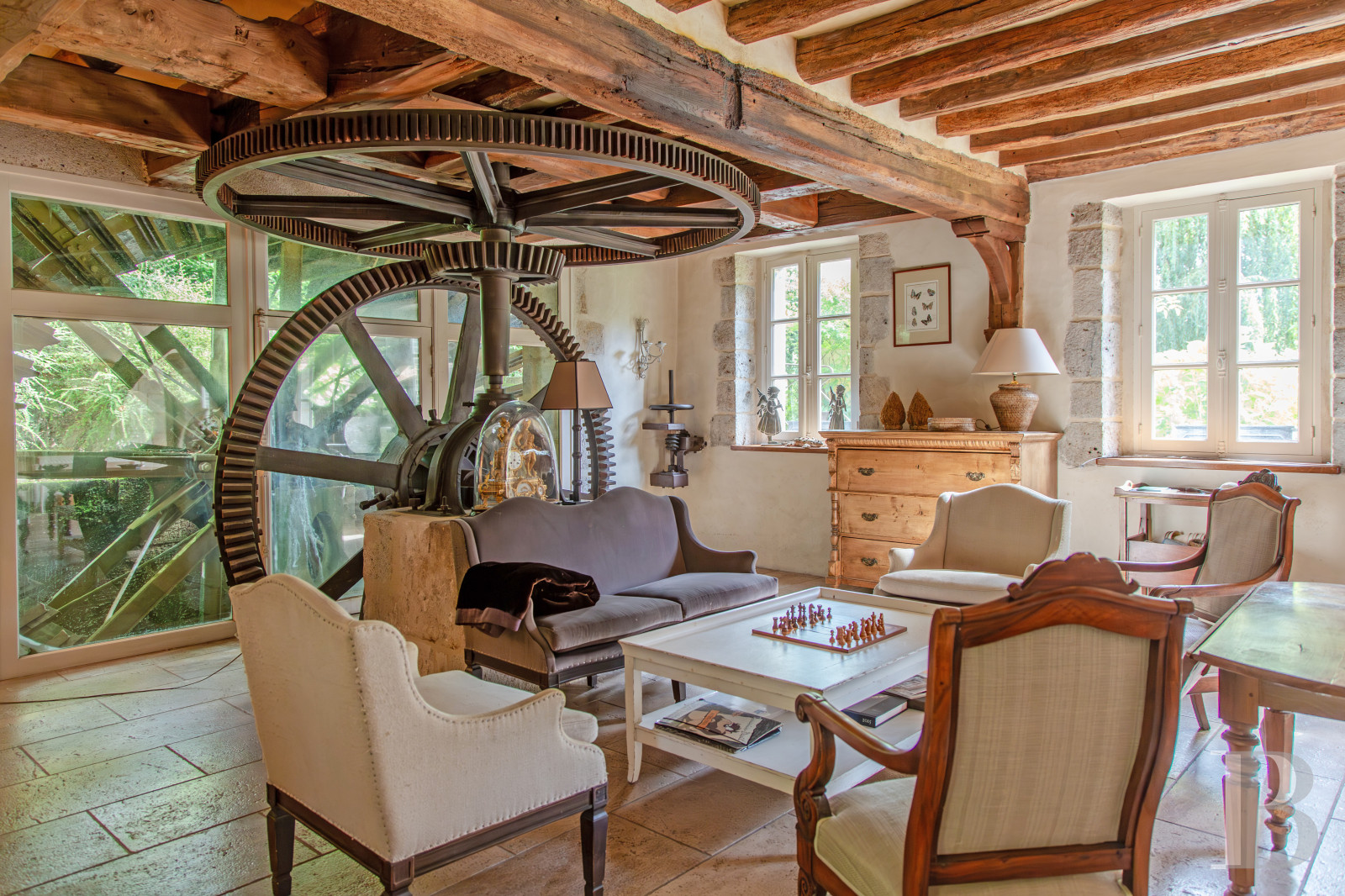 Sheltered from view, they extend over approximately 6,000 m² and are partially enclosed by a stone wall. Past the impressive wrought-iron gate, a cobblestone esplanade leads to an orchard to the south, while, to the west, a bridge crosses the Cléry River and provides access to the mill. Fully landscaped, the area was designed in harmony with the surrounding nature, which is, in turn, highlighted from every angle. As for water, ubiquitous on the property, it enlivens the grounds thanks to its visual presence and gentle sound.