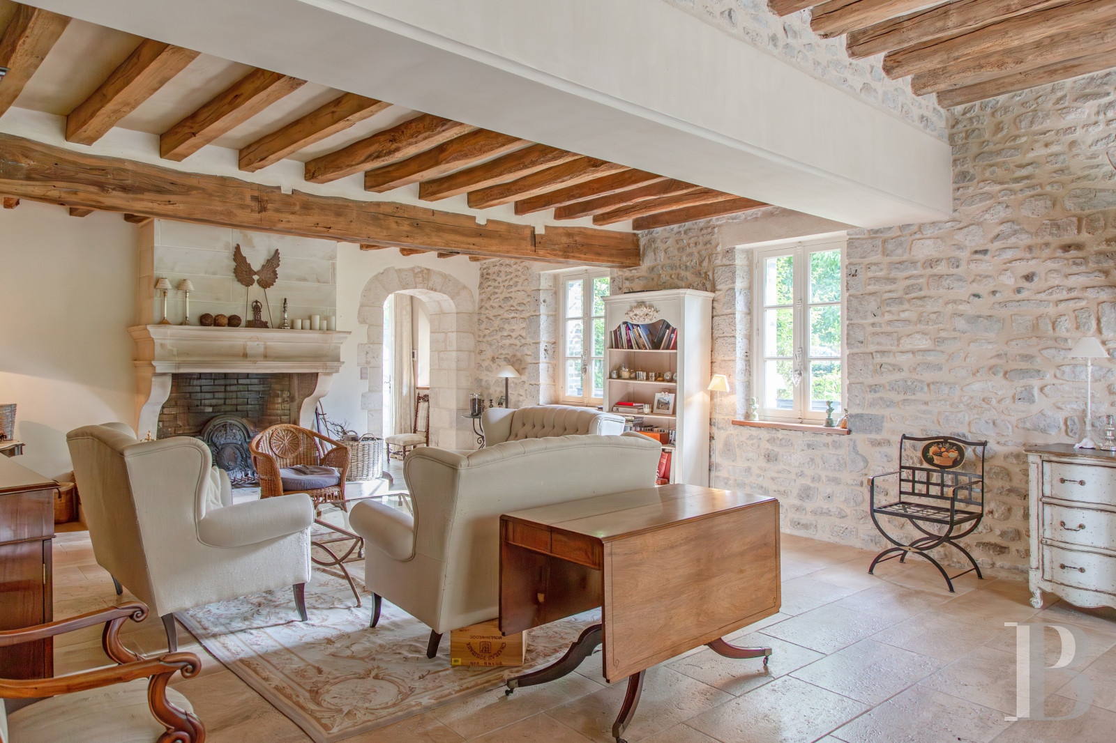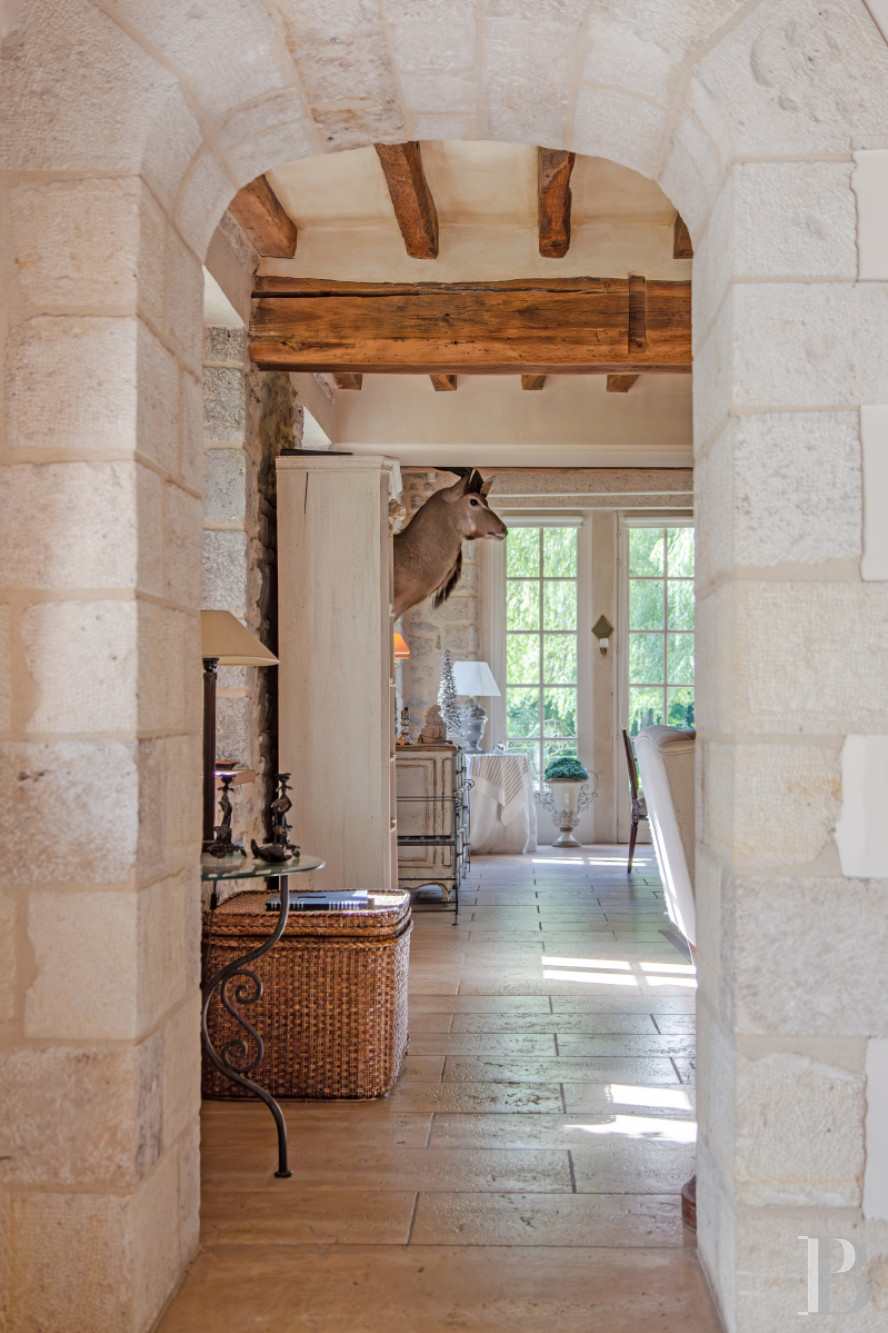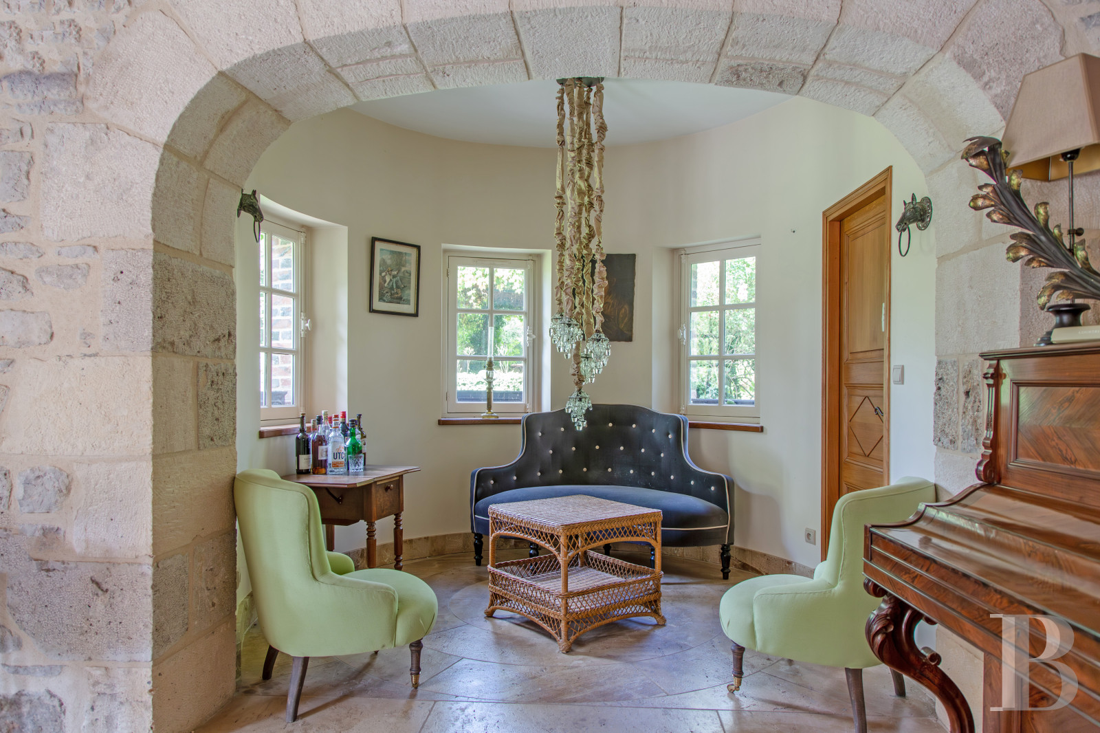 From the initial sitting room, another archway leads to the larger drawing room, divided into two separate areas. The first, with a white stone fireplace and visible ceiling beams is used as the living room, while the second is a dining room, which stands out from the first thanks to its lime-pointed stone walls. Nearby, wide glass double doors give on to the garden and a final archway provides access to a boudoir, with pointed stone walls, located in the western tower.