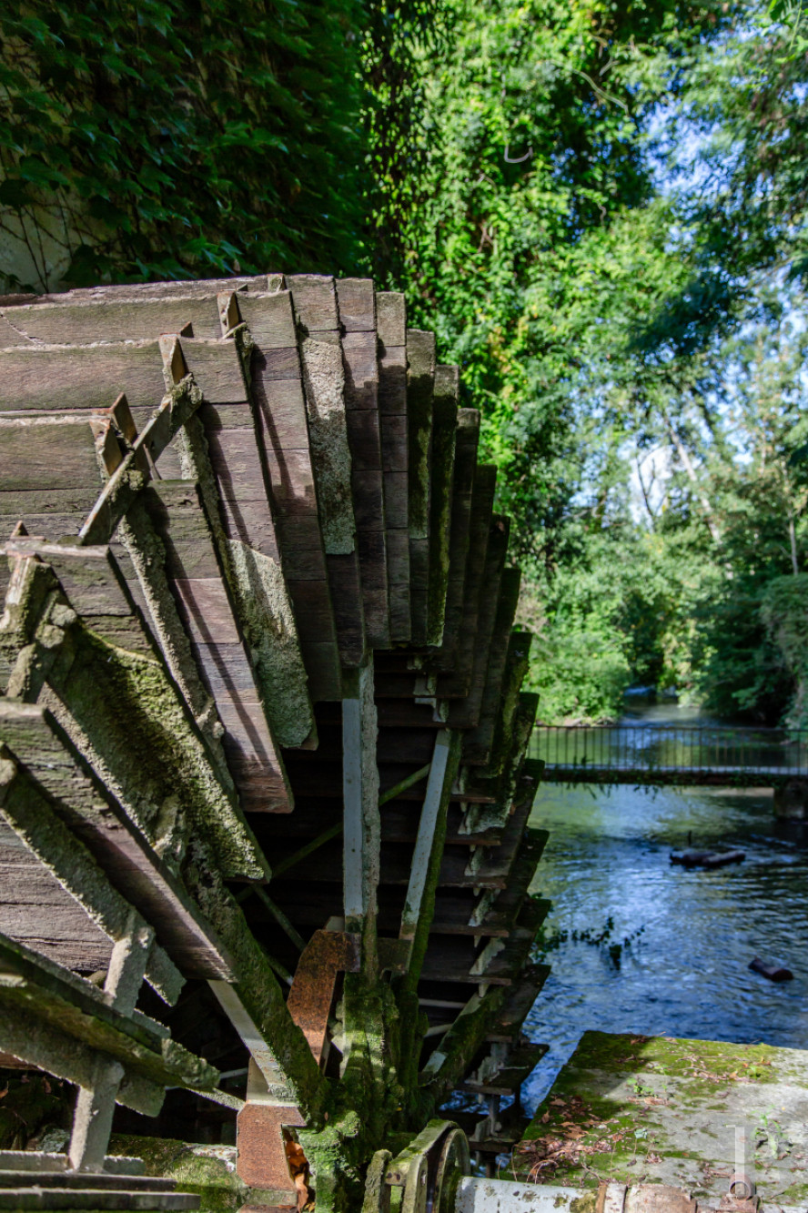 Completely restored, the four-storey building has pointed stone exteriors cadenced by windows and topped with a flat tile roof. Facing southeast, the main façade features an exterior staircase that provides access to the first floor, while an arched glass door opens on to a balcony. To the north, the restored waterwheel, powered by the Cléry, remains a noteworthy item, while, to the south, two large picture windows bathe the two lower floors in light and, to the west, a tower is topped with a flat tile pepperpot roof.