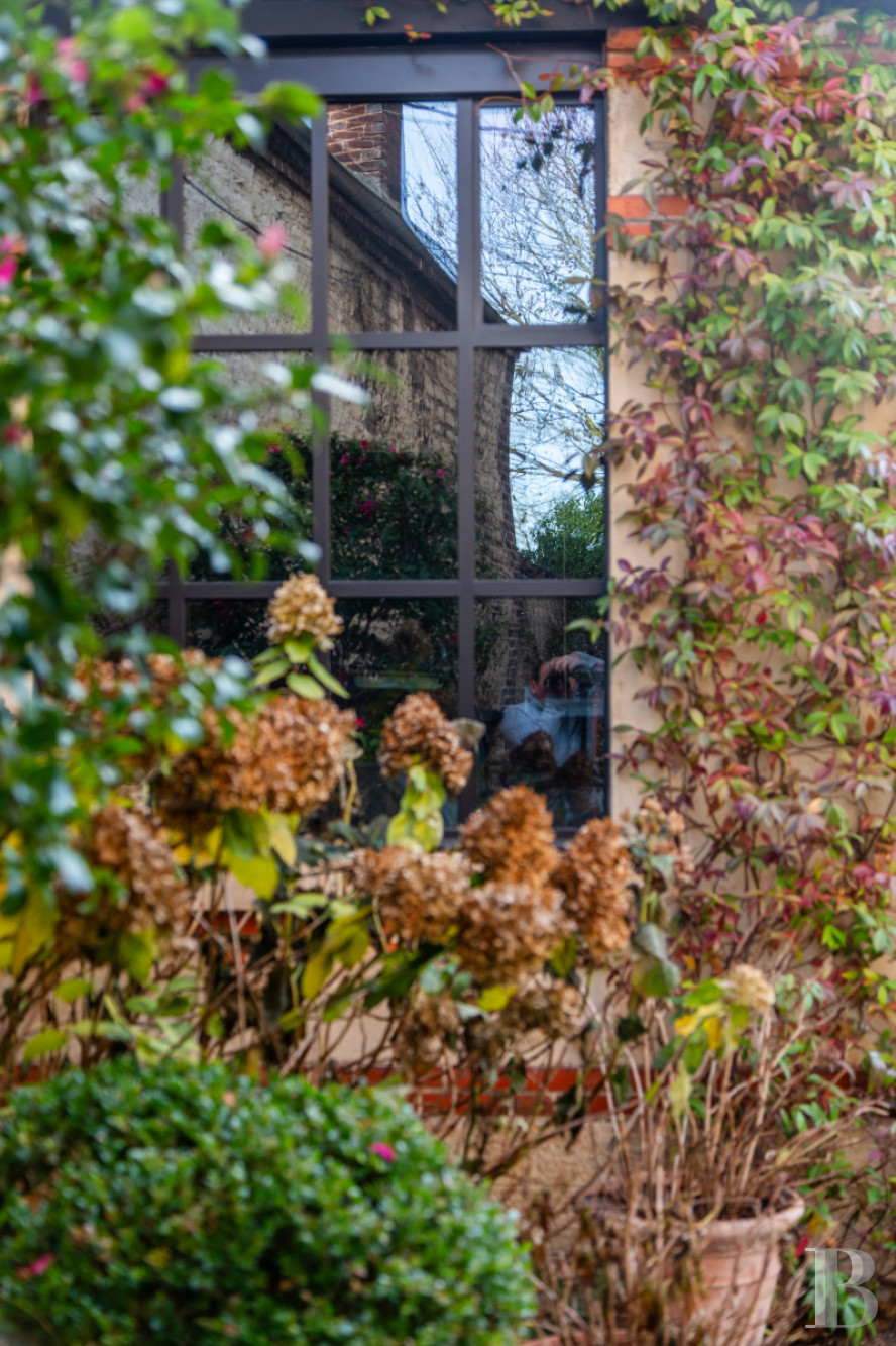 In addition, the verdant garden is structured around an emerald green lawn, a large number of potted plants, a flagstone courtyard and a wall with thick vegetation, which helps shelter the property from view, while a one-storey outbuilding, located in the southwest part of the lot and accessible from both the main street and courtyard, is festooned with climbing vegetation and features a glazed front door, atelier-type windows, a flat slate roof, as well as a bed planted with hydrangeas. Further on, another bed planted with a variety of different flowers extends over a large part of the courtyard, alongside a number of pruned box trees.