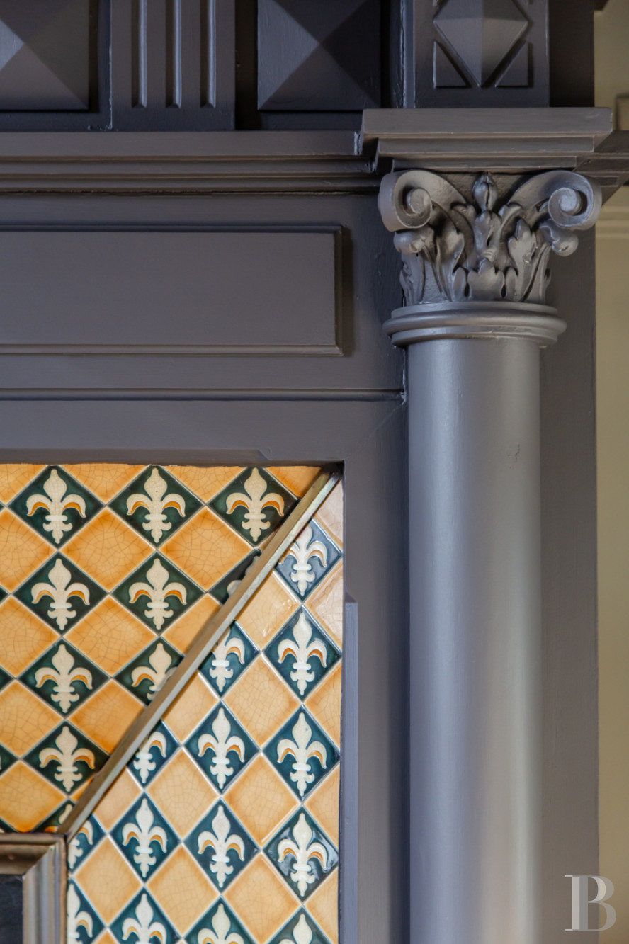 The front door opens on to an entryway that communicates, on one side, with a study and a fitted kitchen opening directly on to the garden, and, on the other, with a living room featuring a ceiling with visible whitewashed joists, windows facing the verdant garden, a massive fireplace with an ornately carved wooden mantel and hood, painted grey, as well as a fireback decorated with cream, yellow and green fleur-de-lis-patterned ceramic tiles, inspired from an original design.