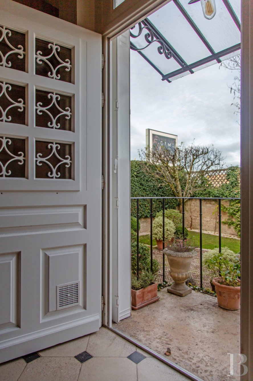 The dwelling is accessible from the courtyard via partially glazed, moulded wooden double doors, painted black, which are safeguarded by wrought-iron grills and topped with a fanlight. Sheltered from the elements thanks to a flat glass and iron awning, it provides access to the ground floor, located at the top of a wide stone staircase, flanked on either side by potted plants.