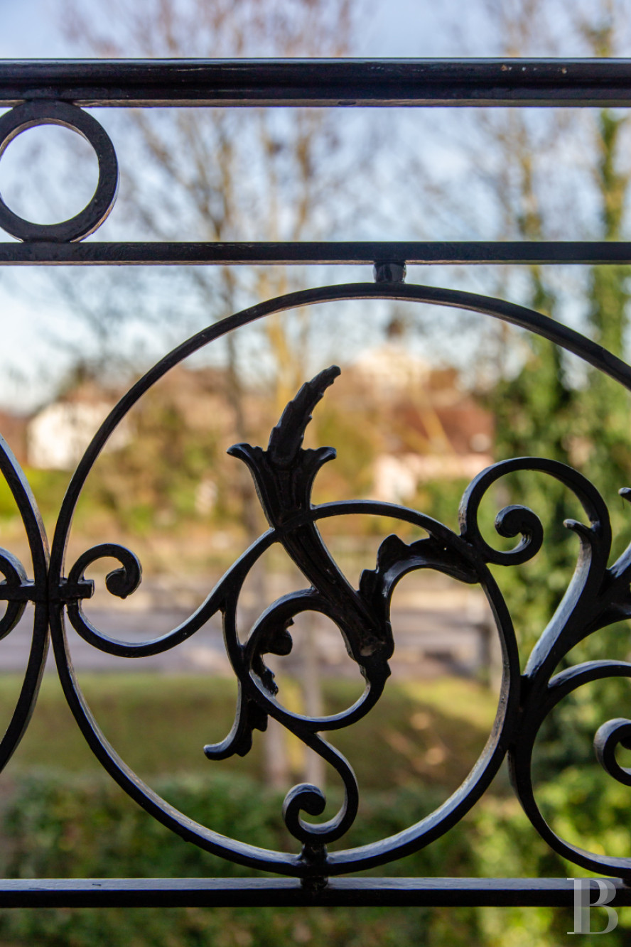 As for the dwelling’s garden-facing side, also featuring buhrstone, it is symmetrical in composition and cadenced by brick stringcourses, quoins and window/door surrounds, while its many openings are primarily topped with low arches and safeguarded by ornate wrought-iron guardrails decorated with vegetal patterns.