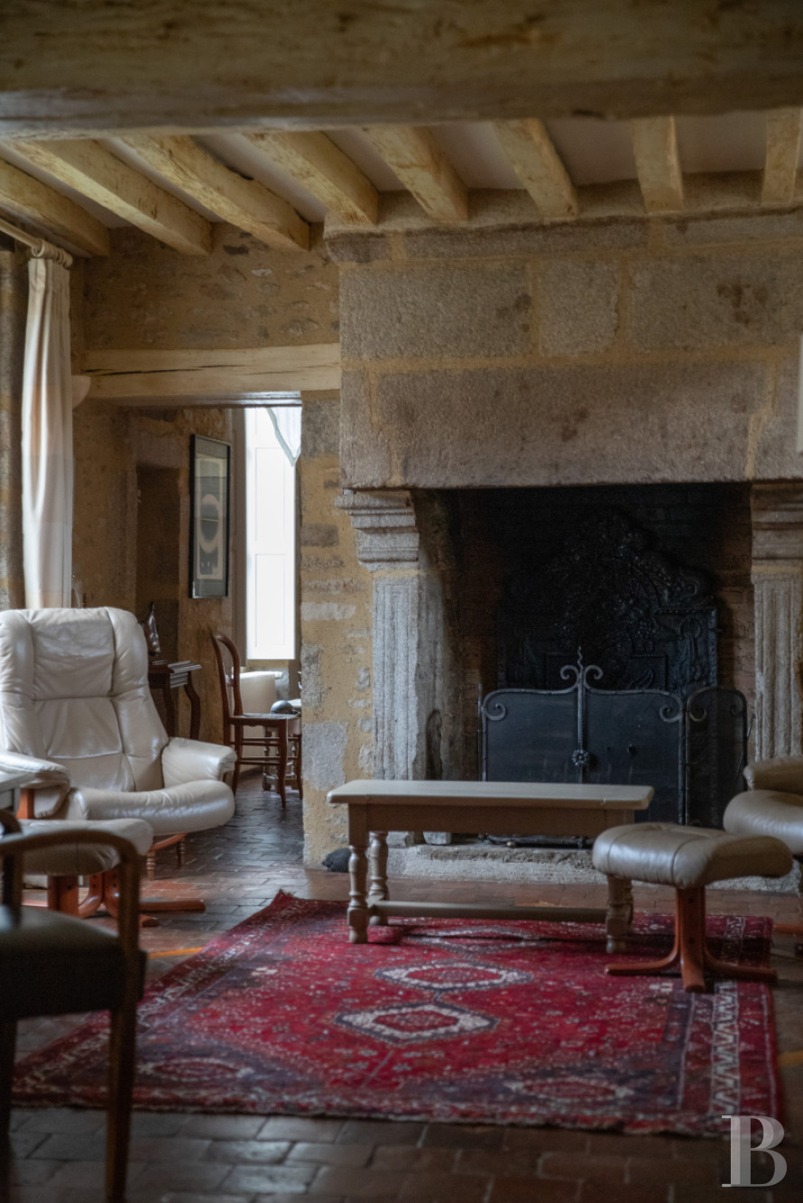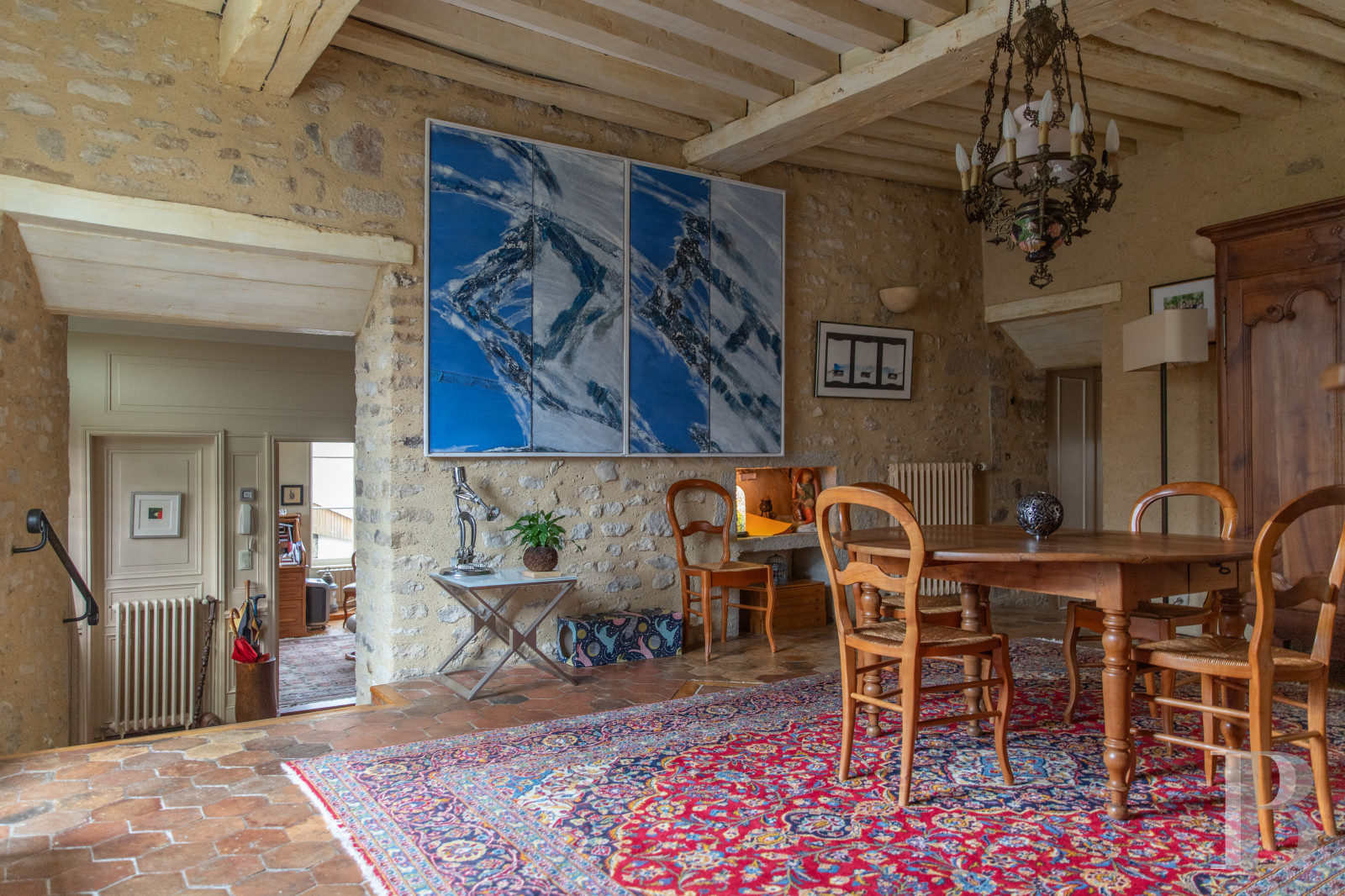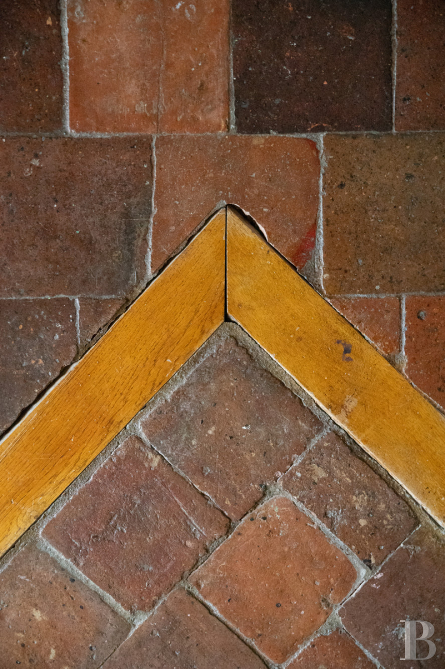 Featuring painted ceiling beams and lime-pointed stone walls, in a palette of colours ranging from beige to yellow, crown moulding, wood panelling, as well as wide windows protected by interior wooden shutters, the living areas also boast original red terracotta floor tiles in a variety of different shapes (hexagonal or rectangular), except for the bedroom with hardwood floors and its shower room, accessible via the glass door under the staircase.