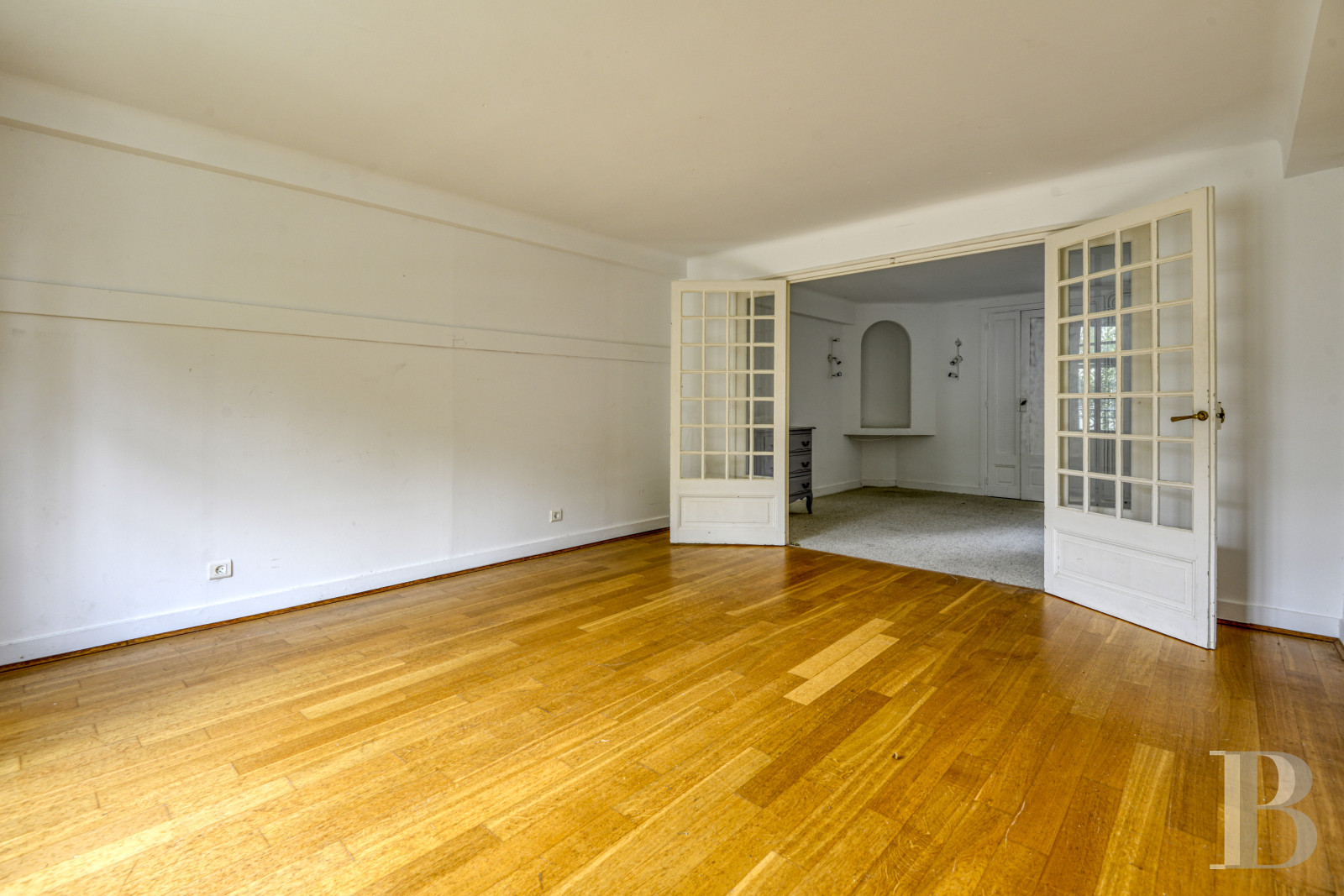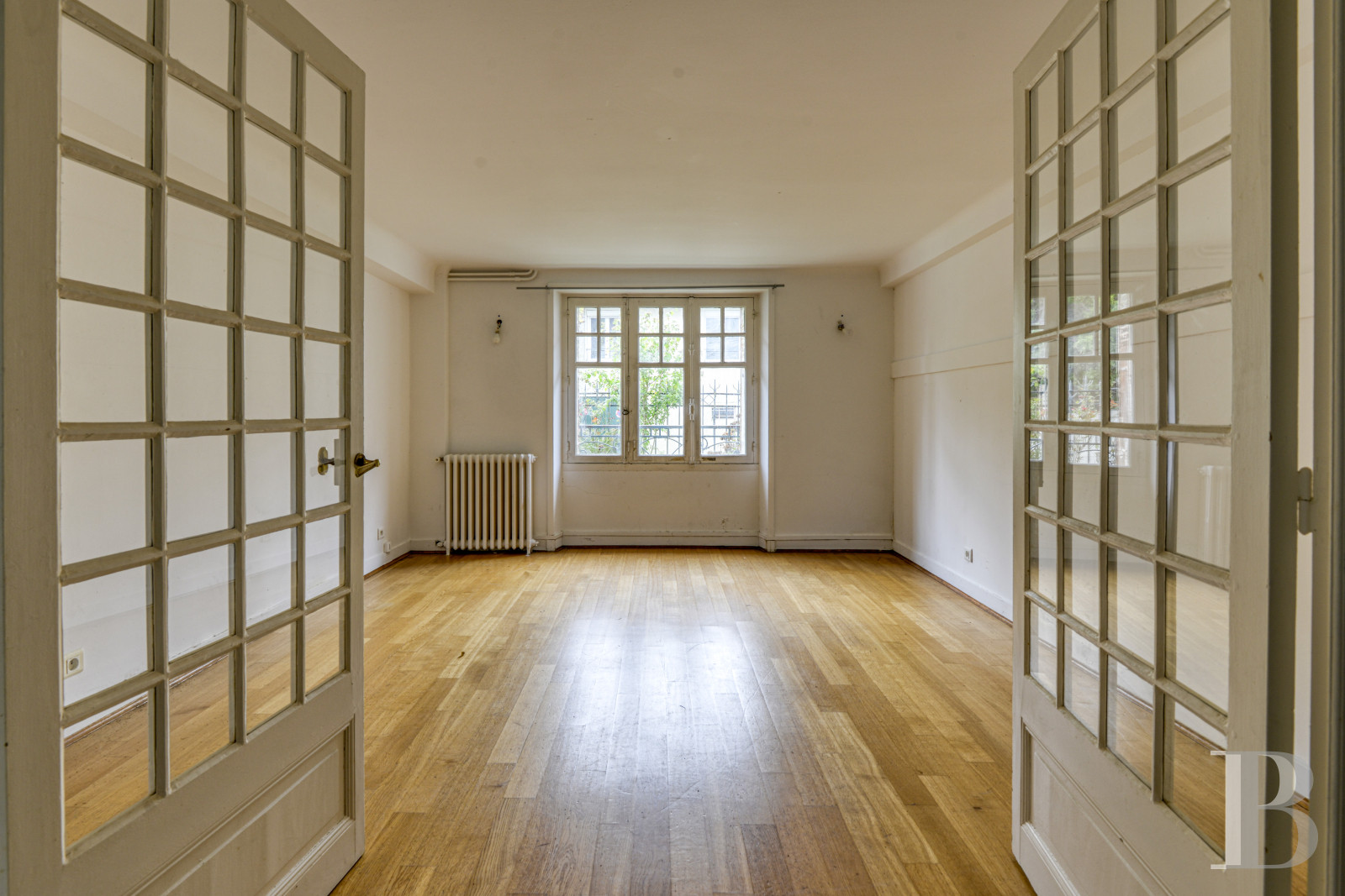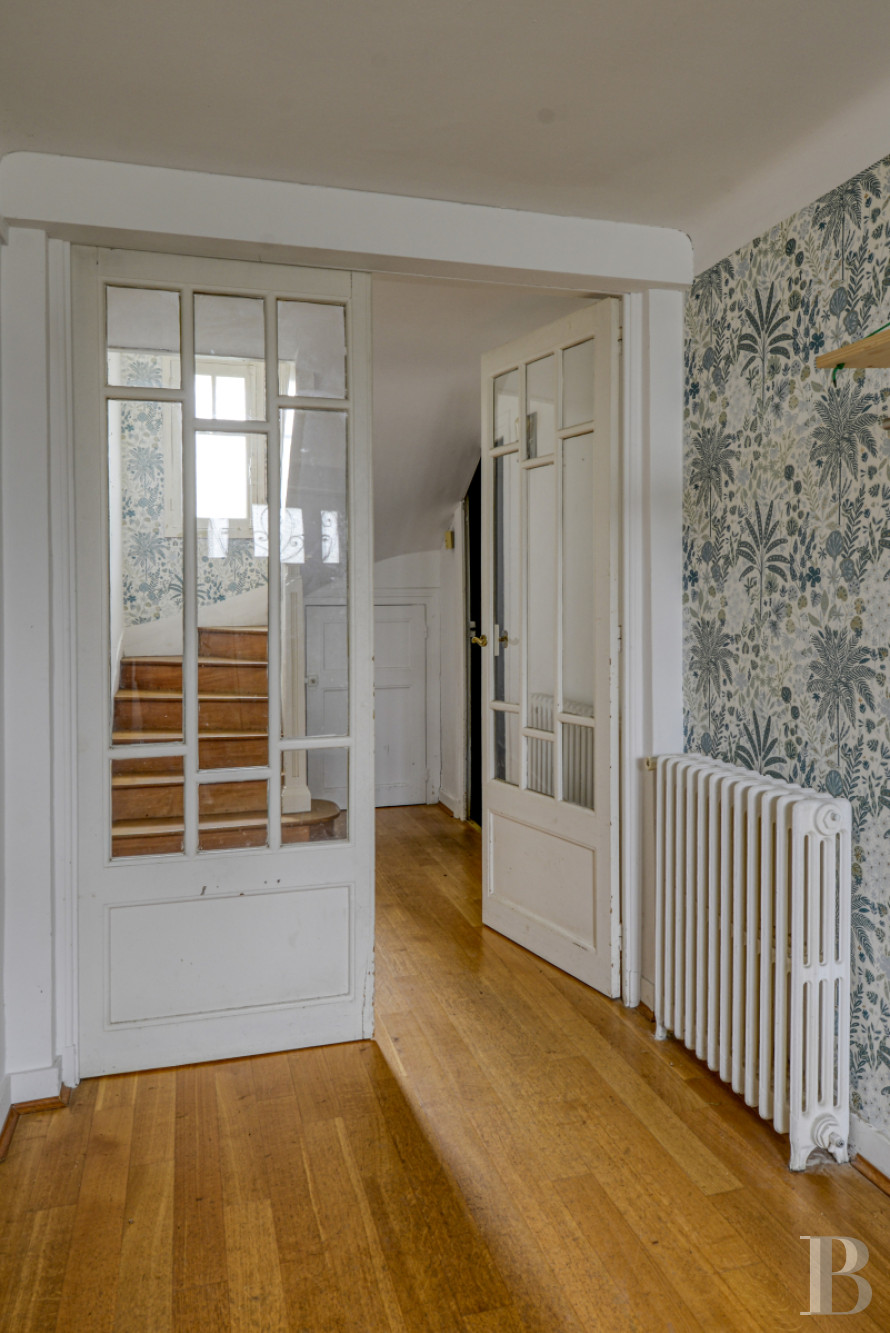 From the landing, double-leaf glazed Art Deco doors lead into a large, west-facing living room bathed in light. The room’s focal point is an elegant and classically painted wooden fireplace. The geometrical décor punctuated by moulded panelling and a central, lozenge shaped pattern give it a sophisticated touch without being ostentatious. It stands on a protruding base and is as decorative as it is functional, striking a nice contrast with the period wood stripped flooring. A master bedroom overlooks the garden and boasts an adjacent shower room. It is followed by a spacious fitted kitchen, paved with large, dark grey tiles, which opens onto the patio via French windows.