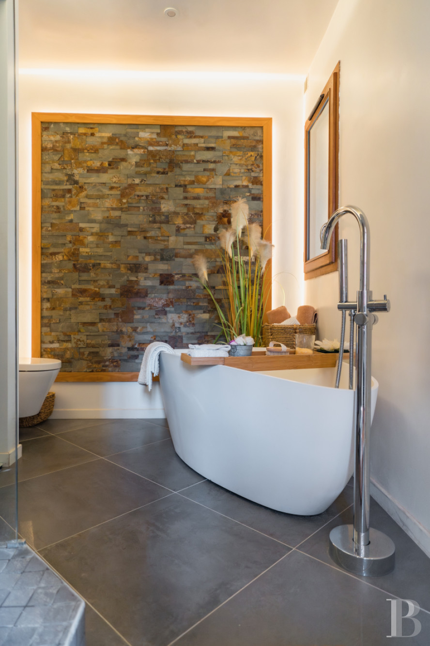 This approximately 40-m² building made of millstone stands over the property’s vaulted cellar and forms a link between the patio and garden. It can be reached via a first patio covered with wood decking, overlooked by wisteria, through an entrance door incorporated into a wide window with a basket handle arch. This small house has been entirely renovated and is made up of a living room, with a wood-burning stove, opening onto another patio with wooden decking and views of the garden. A mezzanine level beneath the rafters includes a sleeping area that looks out onto the Lebanon cedar through the skylights. Two zones have also been converted, in the basement, into an office and a shower room, decorated in Moroccan style.