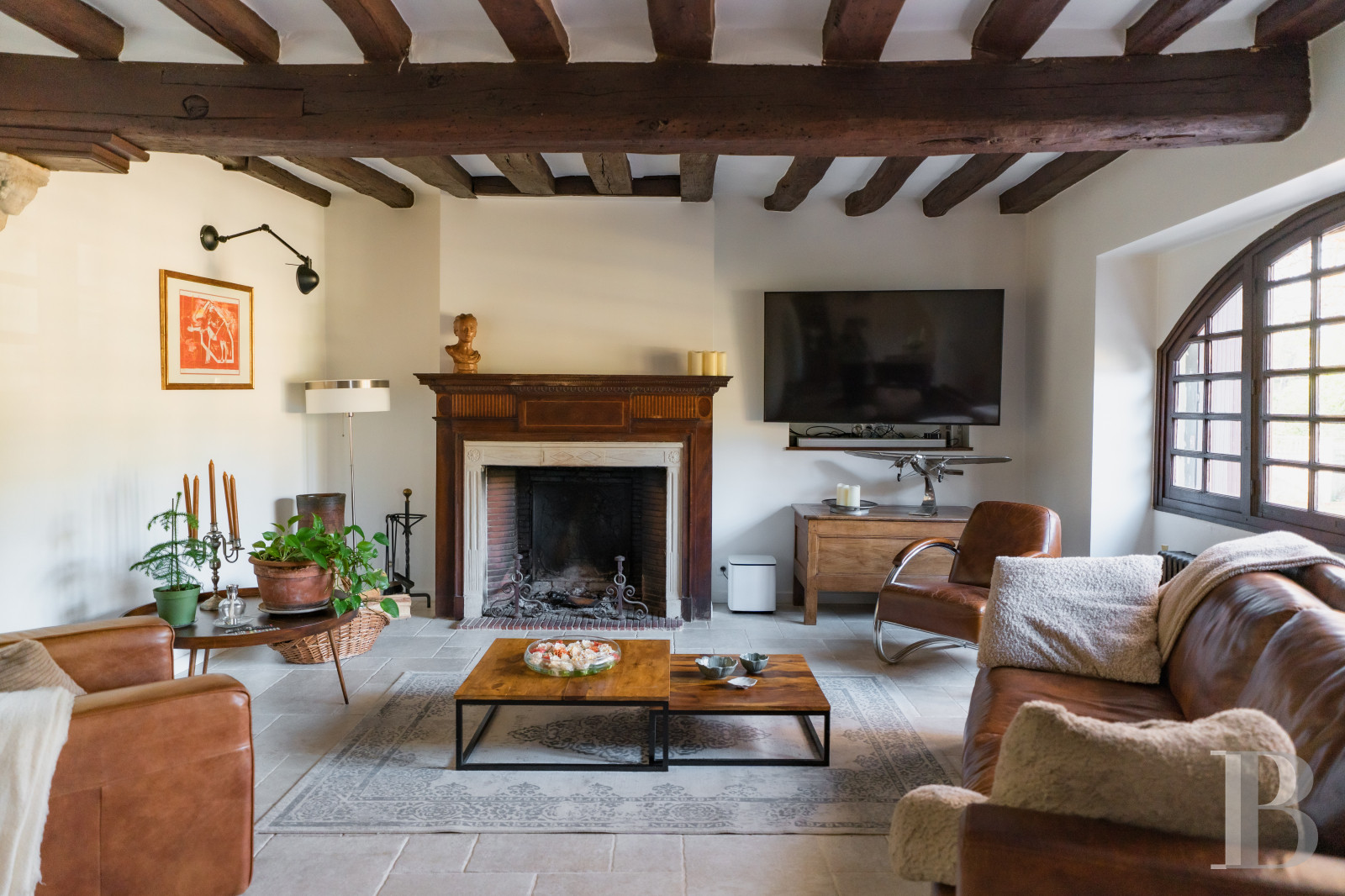 It is oriented east to west and boasts a fluid and functional layout: several reception rooms occupy the ground floor, while three bedrooms can be found on the upper floors. Its style combines a touch of the authentic but also the modern. The immaculate white walls emphasise the warmth of the wood panelling, joinery and exposed oakwood beams on the ceilings.