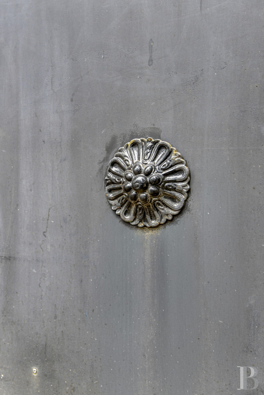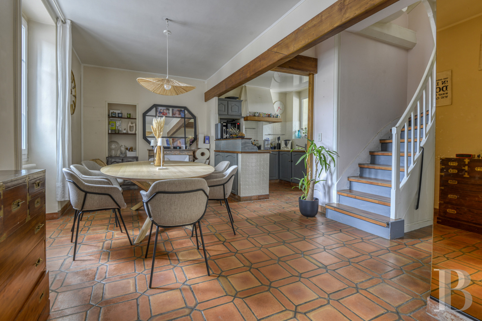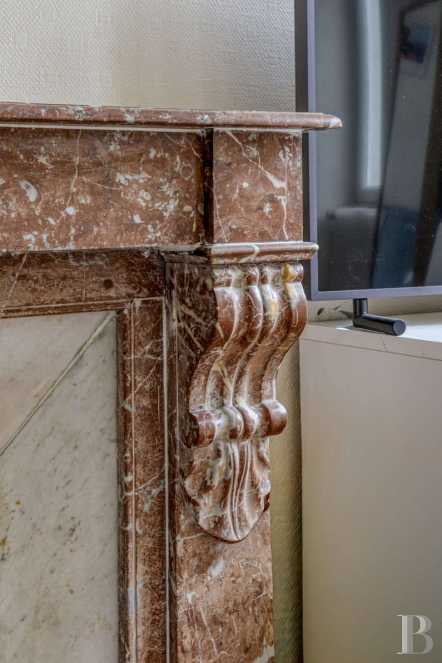 With terracotta cabochon tile floors, in warm shades ranging from ochre to brown, the main living areas are decorated with crown moulding and a ceiling rose. From the cobblestone drive, the dwelling is accessible via a glass door that opens on to the entrance hall, the latter of which provides access to two living areas: the first, facing east towards the courtyard, could also be converted into a ground floor bedroom, while, the second, facing the street, communicates with an adjacent dining room, located along the house’s western façade and featuring a pink marble open-hearth fireplace as well as a niche fitted with shelves.