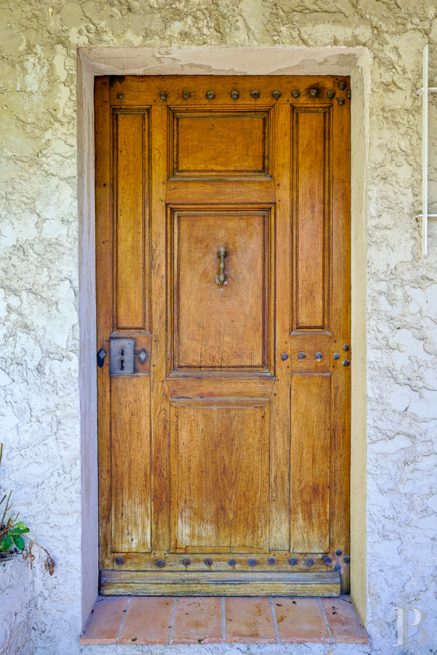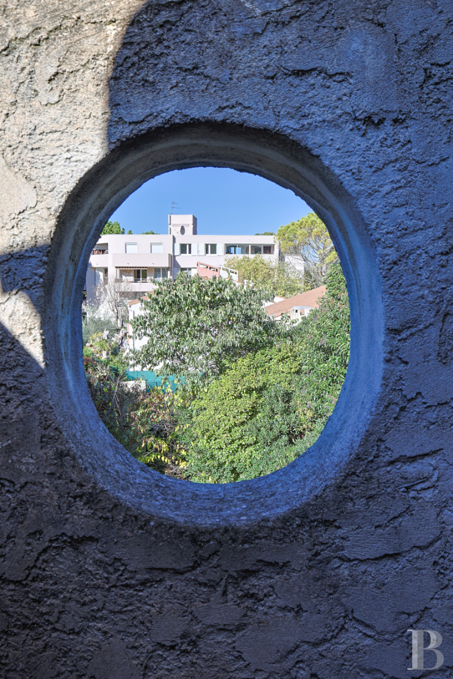 The villa is made up of three sections in an inverted U-shape, all with roofs made of interlocking tiles. The facades are wide open to the exterior thanks to large windows fitted with wooden panels or shutters, in need of restoration. The main entrance to the house is via the west to east oriented central section, set slightly back from the other two parts. It houses an approximately 27-m² kitchen and leads to two other rooms as well as a garage. On the top floor, two suites each including a bedroom, a bathroom and a lavatory also boast roof terraces.