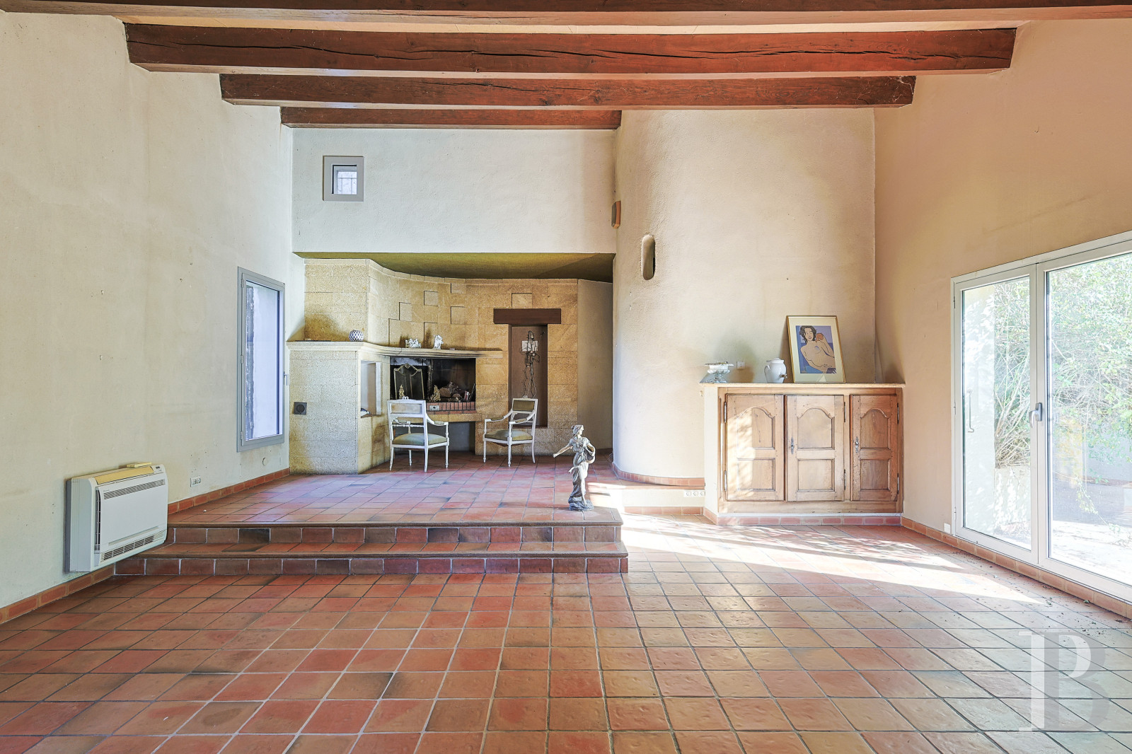 The western section is set diagonally southwest/northeast to the central edifice and contains an around 66-m² lounge with a fireplace. The eastern section, set north to south, stands perpendicularly to the central section and includes three bedrooms as well as a shared bathroom. The rooms on the ground floor are either paved with terracotta tiles or cement tiles. The house is equipped with electric heating and air conditioning.