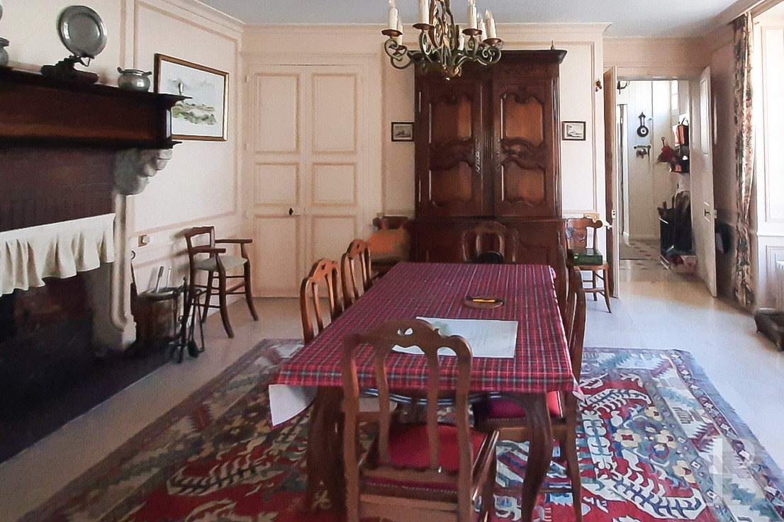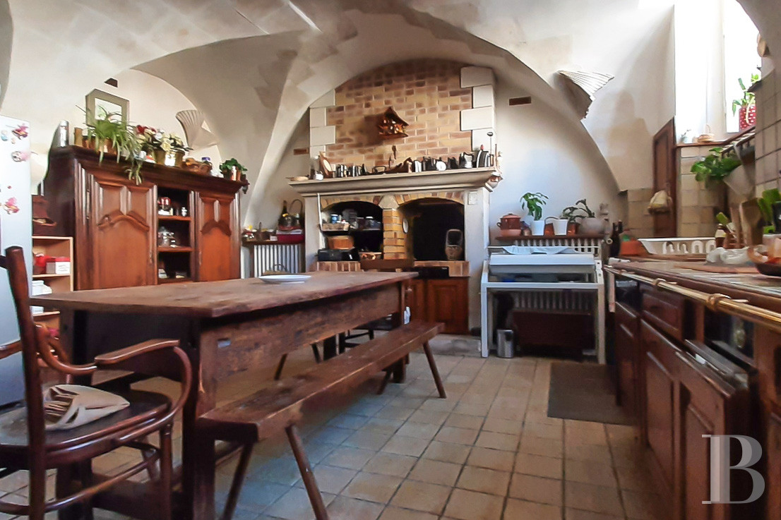 The door leads into a small hallway with a floor of Burgundy stone slabs patterned with polished slate square inserts. On the left, this hall connects to a dining room, which also has a floor of Burgundy stone slabs, as well as a fireplace with jambs sculpted with busts, and then to a lounge with similar flooring and garden-facing windows. On the right, there is a large kitchen with a cross-vault ceiling and a rustic fireplace of stone and brick that reminds us of the time of construction of this house, which was built in 1750. A small pantry at the back serves as a linen and utility room. At the end of the entrance hall, there is a staircase of solid oak with large balusters. It takes you up to the two upper floors of this pavilion.