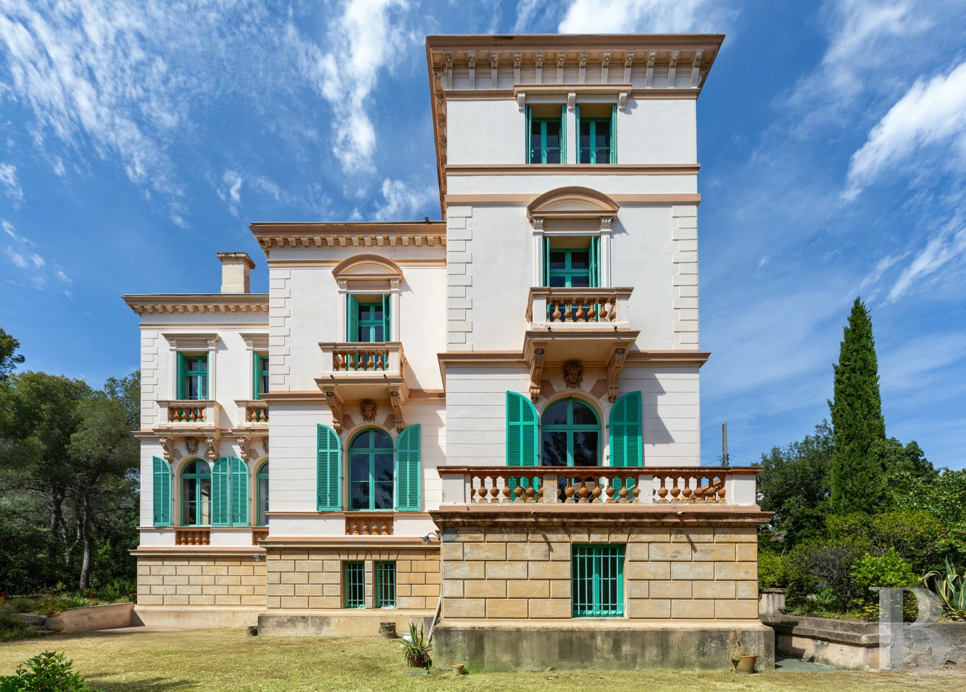 In typical late 19th-century style, the residence comprises three rectangular sections arranged one in front of the other from the rear façade of the main building, following the slope of the land. The two rear sections have one storey, while the front section, facing south, has two. The façades are wide and have several regularly arranged windows. Two of the façades face the grounds and the entrance. They are refined, combining the sobriety of their light-coloured rendering with exposed stone ornamental work, with straight and curved shapes for all of the corner ties, doorways and balconies. The windows are round-headed on the ground floor and rectangular on the garden level and the two upper levels. The wooden windows are high, which is typical of southern architecture. Several balconies and terraces provide access to the ground and first floors via French windows. Mascarons, framed by sculpted brackets supporting small stone balconies, adorn the main façade at the lintel keys. Lastly, upper storey bands and a cornice with modillions, all rendered in the same shade of brick as the pediments or lintels above many of the windows, provide rhythm and colour to the various façades. Inside, the three floors are accessed by a large solid wood staircase with steel railings, set against the rear wall. The floors, which are original, are terracotta and cement tiles.