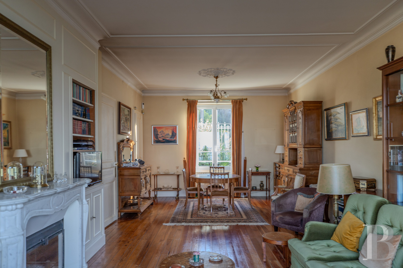 A flight of front steps leads up from the street-side gate to the entrance door in the house’s central bay. Inside, the entrance hall offers storage spaces. On one side, this hallway connects to a lounge and dining area and to a kitchen. On the other side, it connects to a bathroom with a lavatory. A door takes you to the garden-level floor and the garage. The main lounge is a dual-aspect space that faces east and west. From its bay window, you can admire a clear panoramic view of the sea and the town of Dinard. This vista is absolutely remarkable. The room has wood strip flooring and is richly embellished with friezes, cornices, ceiling roses and wooden panelling that hides a cupboard and bookshelves. A white marble fireplace with an insert stands against one of the walls. A hallway separates the kitchen from the lounge. This kitchen has a terrace with a clear west-facing view of the sea.
