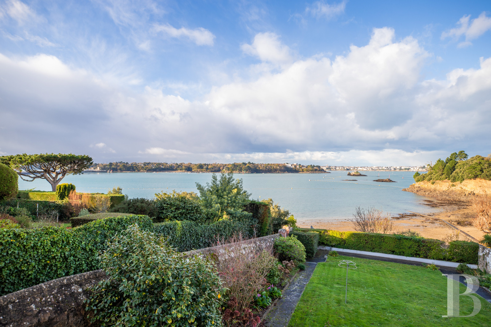 On the west side, there is a gently sloping garden edged with flowerbeds and shrubs. It offers a clear view of the sea and the town of Dinard. At the end of the garden, a gate in the enclosing wall leads to a path that takes you to a neighbouring beach.