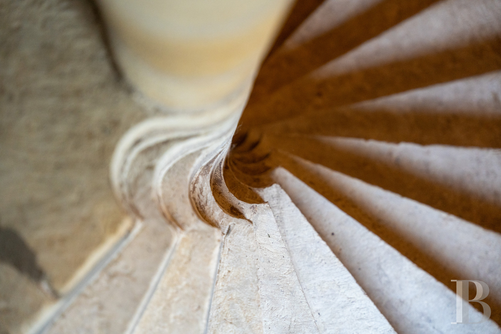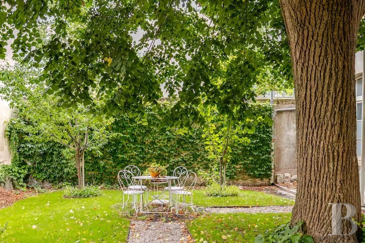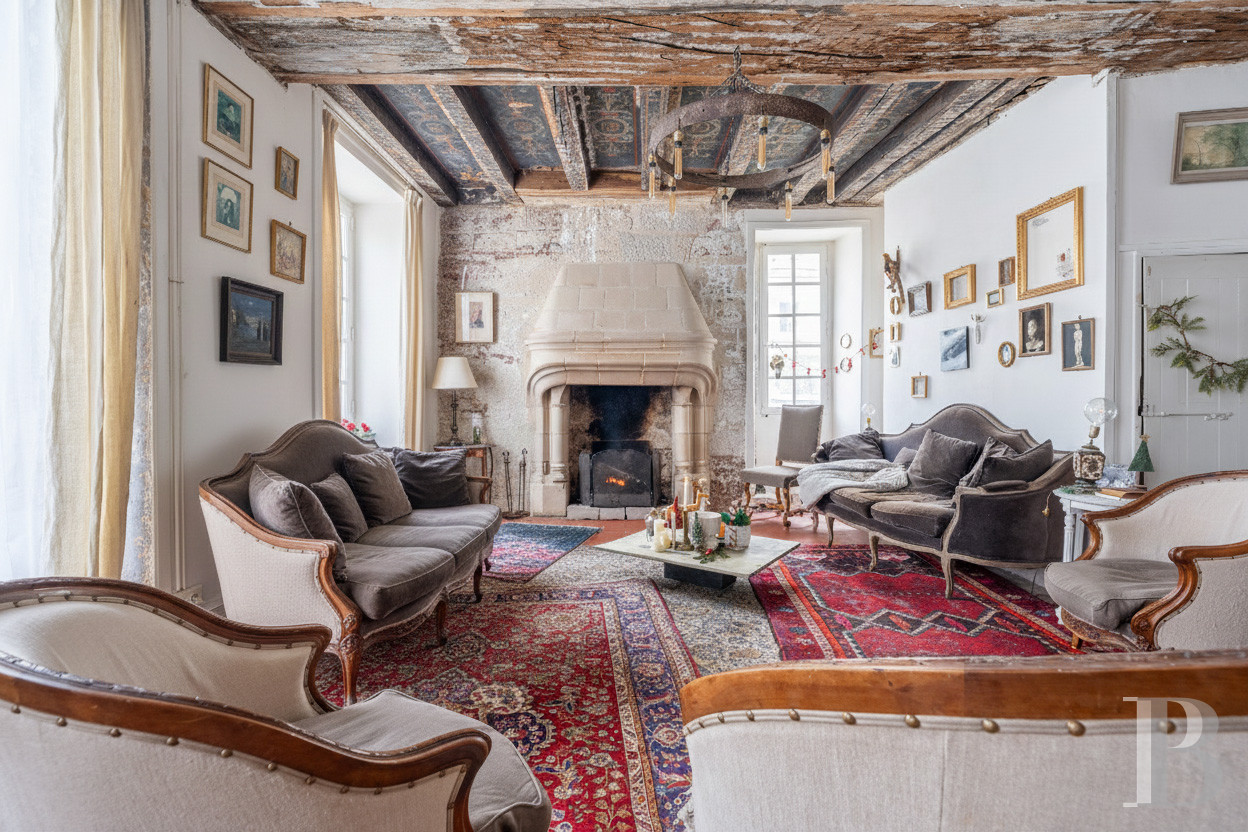 This level includes the residence’s living rooms, including a vast dining room with a kitchen area, fitted with a wood-burning stove. The straight wood stripped flooring was installed in 1890. The remains of the ceiling painted in Florentine grayscale are still visible. The lounge situated close by overlooks the street and includes a tuffeau stone fireplace with rounded edges standing against one of the walls, while the floor is paved with terracotta tiling. The remarkable ceilings, painted with ochre-coloured patterns, rosettes and initials on a blue background, were revealed during the most recent restoration of the building in 2017.