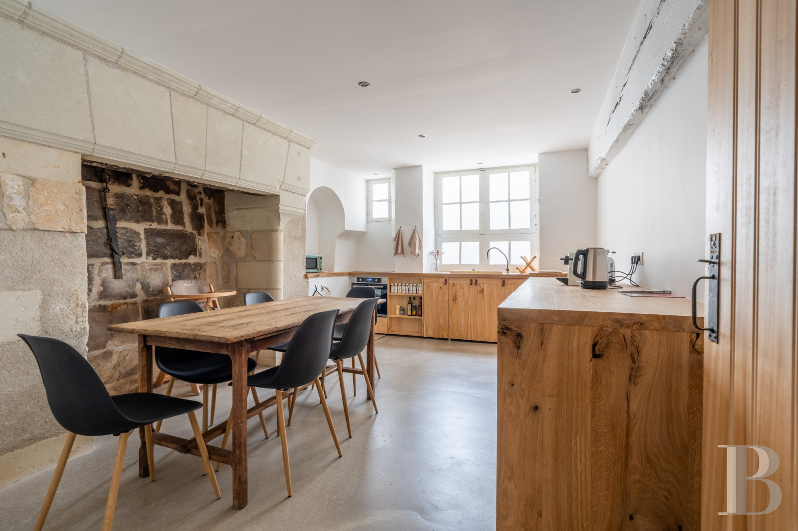 This level can be reached via the courtyard. The hall plays host to a tuffeau stone spiral staircase climbing to the upper floors. The ground floor is currently occupied by a PRM compatible holiday let. A bedroom opens out via a door onto the garden outside. In the fitted kitchen, there is a carefully restored, monumental tuffeau stone fireplace as well as an adjoining bread oven. The kitchen is followed by a bathroom with a shower and a whirlpool bath. The flooring is made up of an alternation of polished concrete and terracotta tiles. The main rooms face the street and the courtyard.
