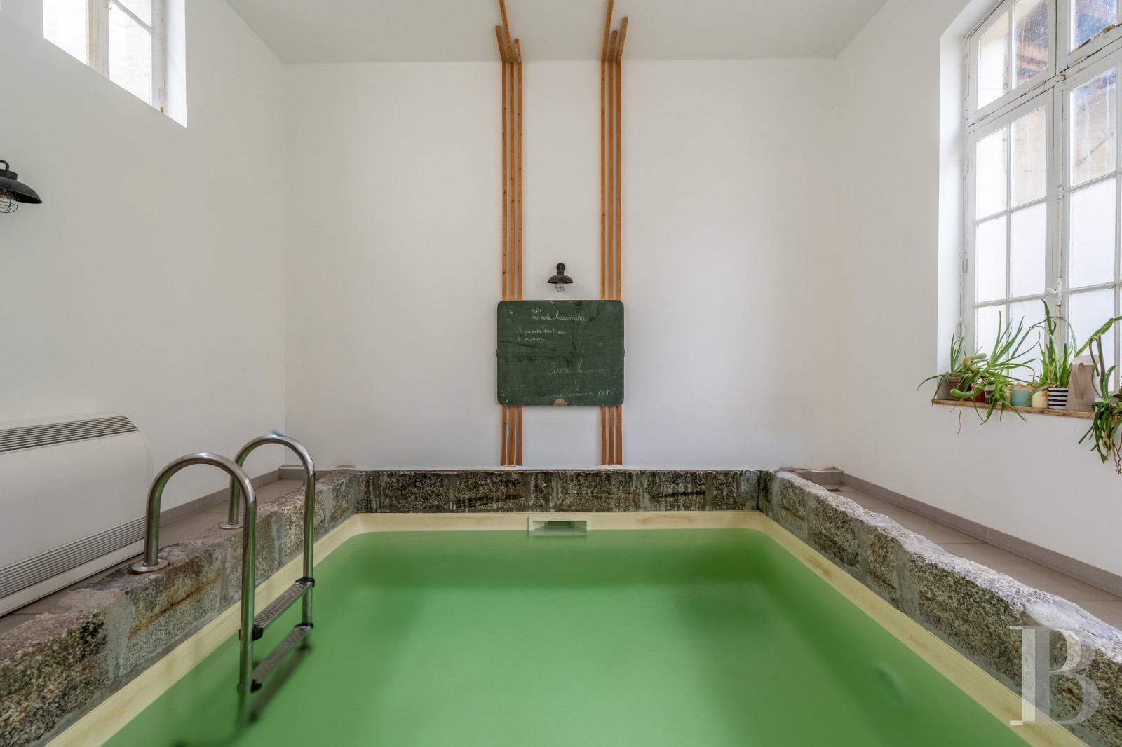 The interior has retained features of its educational past. Indeed, several old exercise books have been found and put on display. The flooring is made up of small tiles throughout. The main living room leads to three bedrooms, with glass wall partitions manufactured in Bourgueil. Behind a wood-burning stove, there is a partition made up of bricks fired in a wood-burning kiln to enable radiation of the heat produced. The building possesses a shower room that can be reached from the kitchen. The refectory has an entrance from the courtyard and has been transformed into a spa space, with a 3-metres by 3-metres heated indoor swimming pool that is 1.10 metres deep. It is also equipped with a counter-current swimming system. Another classroom, which can also be reached from the courtyard, has been transformed into a workshop.