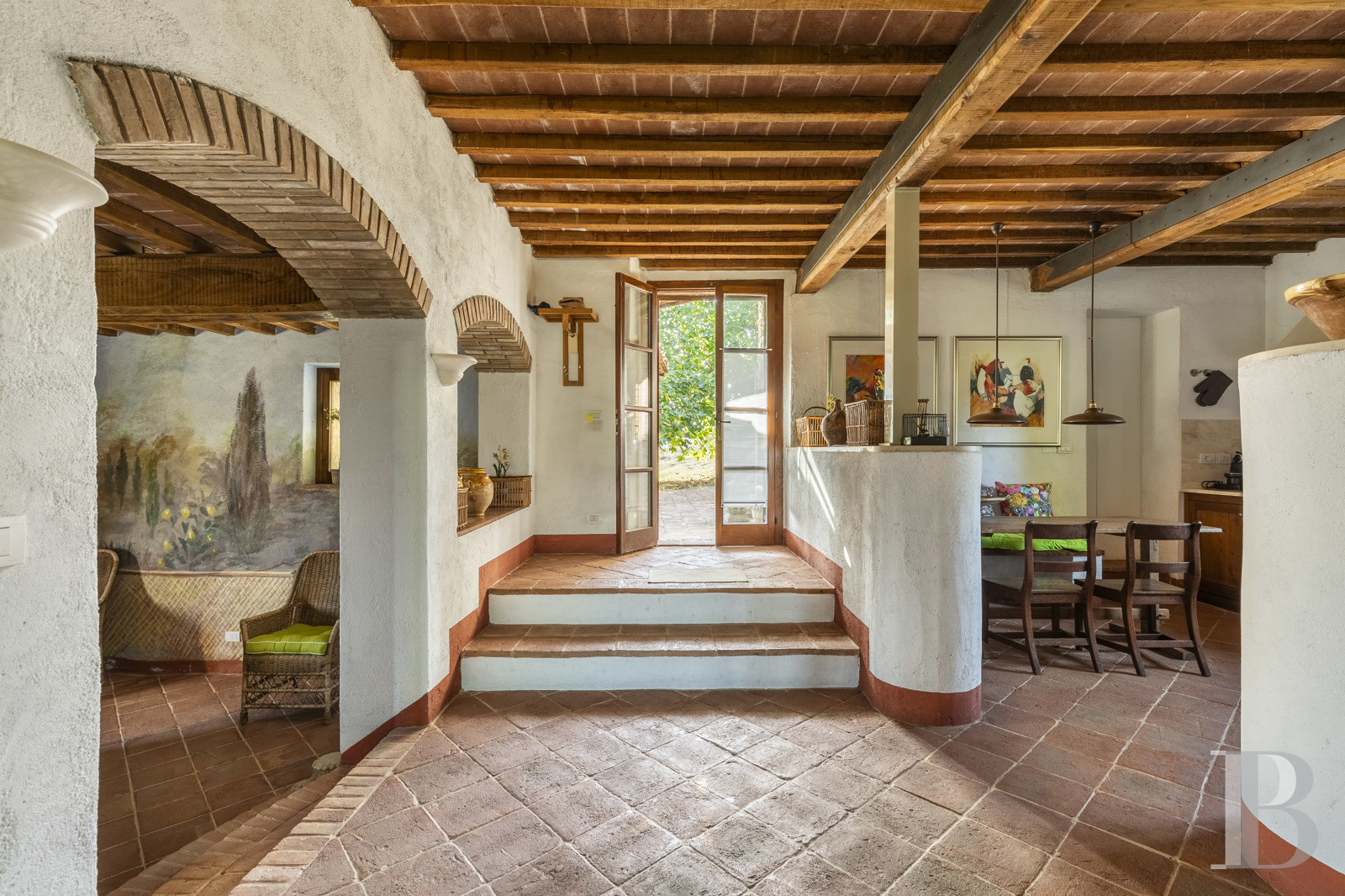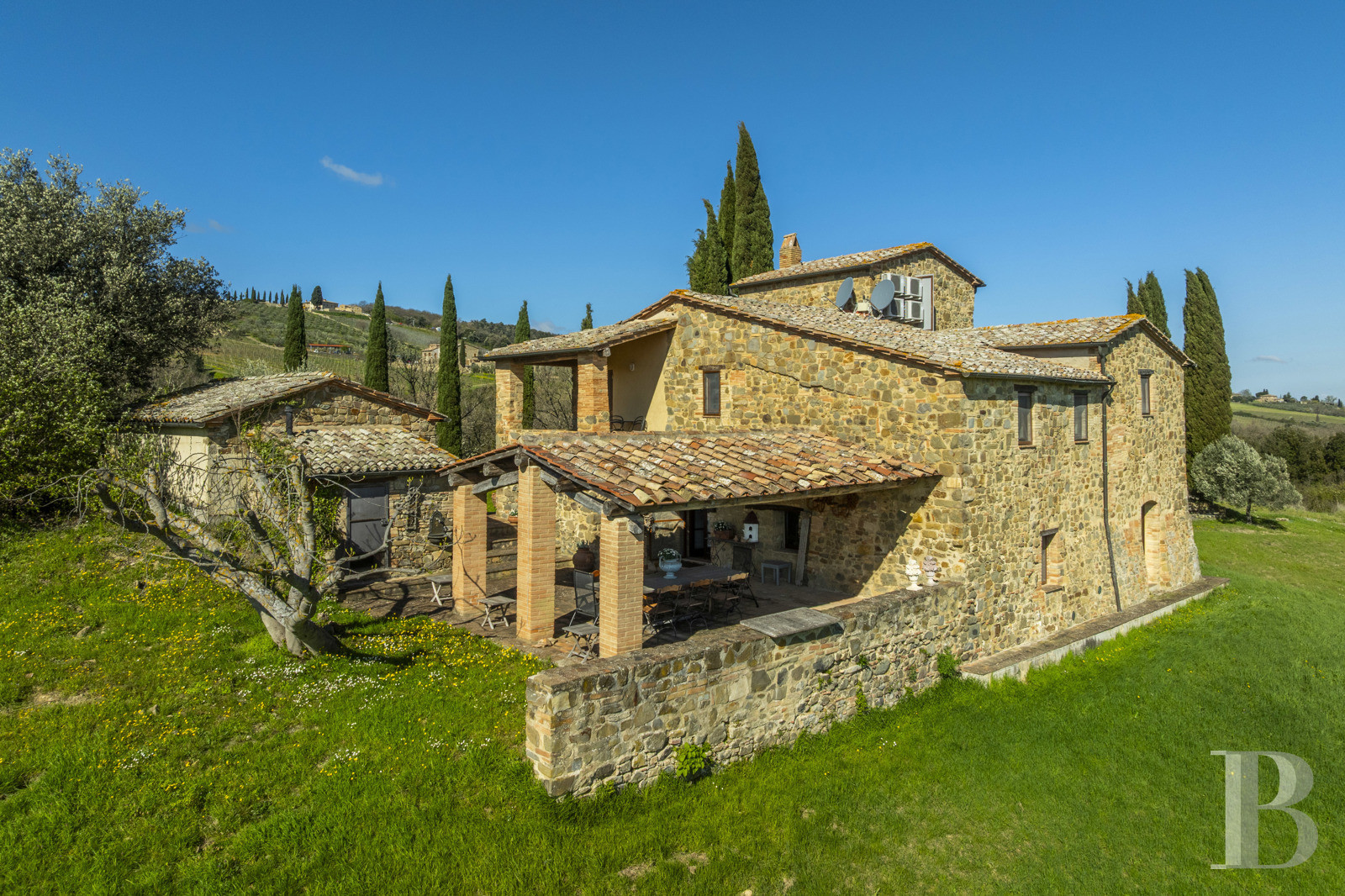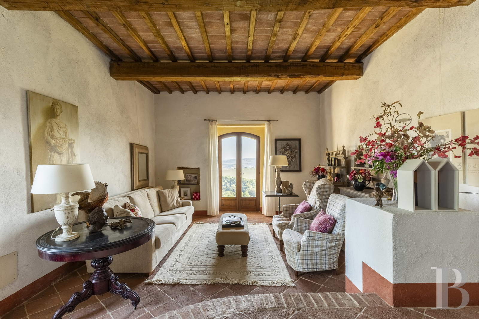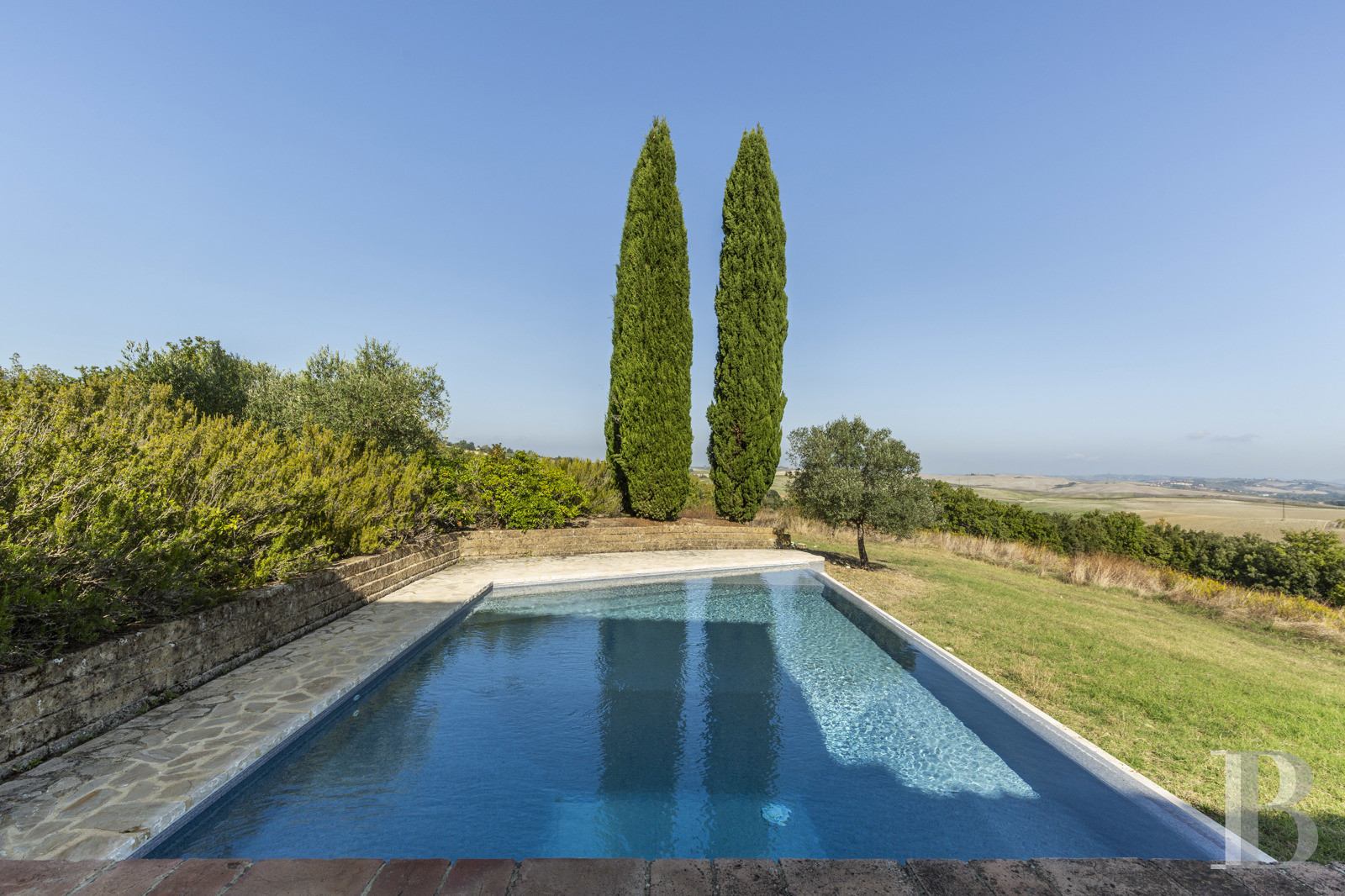 Here, stone is not merely used to build a shelter: it blends in with the landscape. The large windows of the house frame the Val d'Orcia like so many perspectives where the light changes throughout the day. The cypress trees that dot the property provide vertical landmarks in the rolling hills. Inside, brick arches divide the spaces without partitioning them. The spaces can be adapted to different uses: permanent residence or temporary accommodation. The infinity pool extends the view towards Montalcino and its vineyards. The house retains that rare quality of allowing everyday life to be directly connected to the Tuscan countryside, between centuries-old olive trees and winding roads leading to the Brunello cellars.