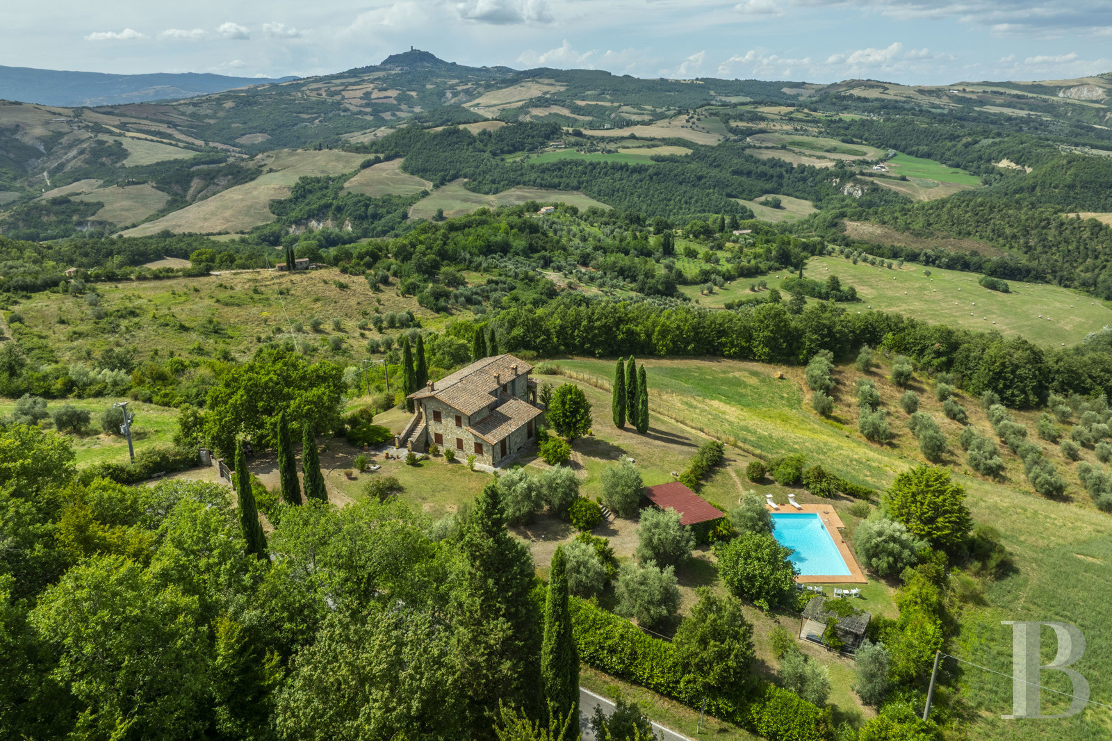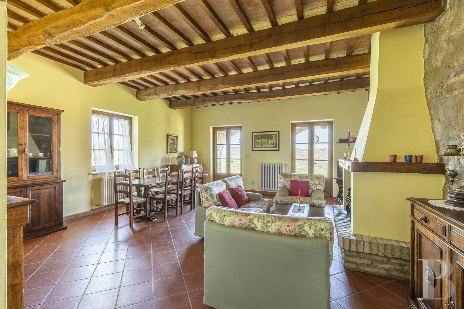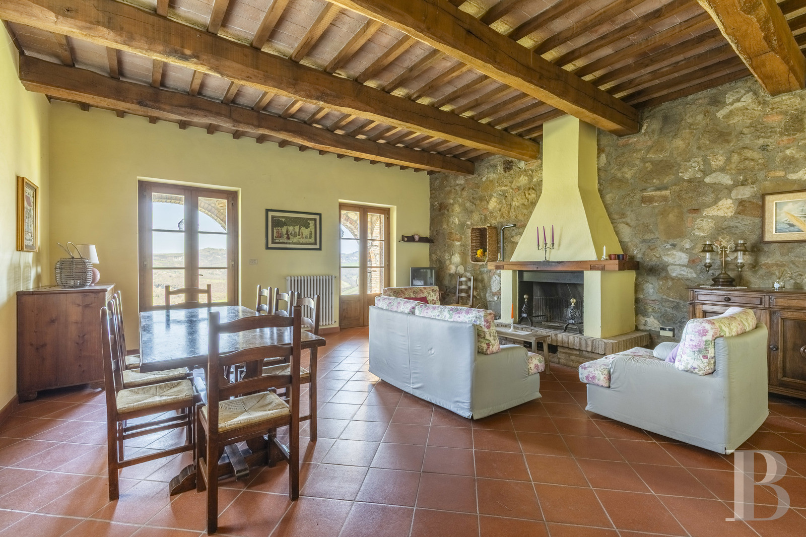 A Tuscan residence in the heart of Val d'Orcia, between Siena and Lake Trasimeno. The residence has three floors and features spacious rooms flooded with natural light. The living room occupies the ground floor, along with a kitchen and several service areas. Upstairs, the bedrooms benefit from high ceilings and unobstructed views of the surrounding countryside. The basement houses a vaulted tavern, a multipurpose space whose use remains to be defined. The garden surrounds the house on several sides, structured around a swimming pool facing the hills. Agricultural land extends the property, planted with olive trees still in production. San Casciano dei Bagni is a few kilometres away: a spa village renowned for its springs and its recently discovered Roman archaeological site. A property that offers the dual possibility of a permanent residence or a tourist accommodation business.