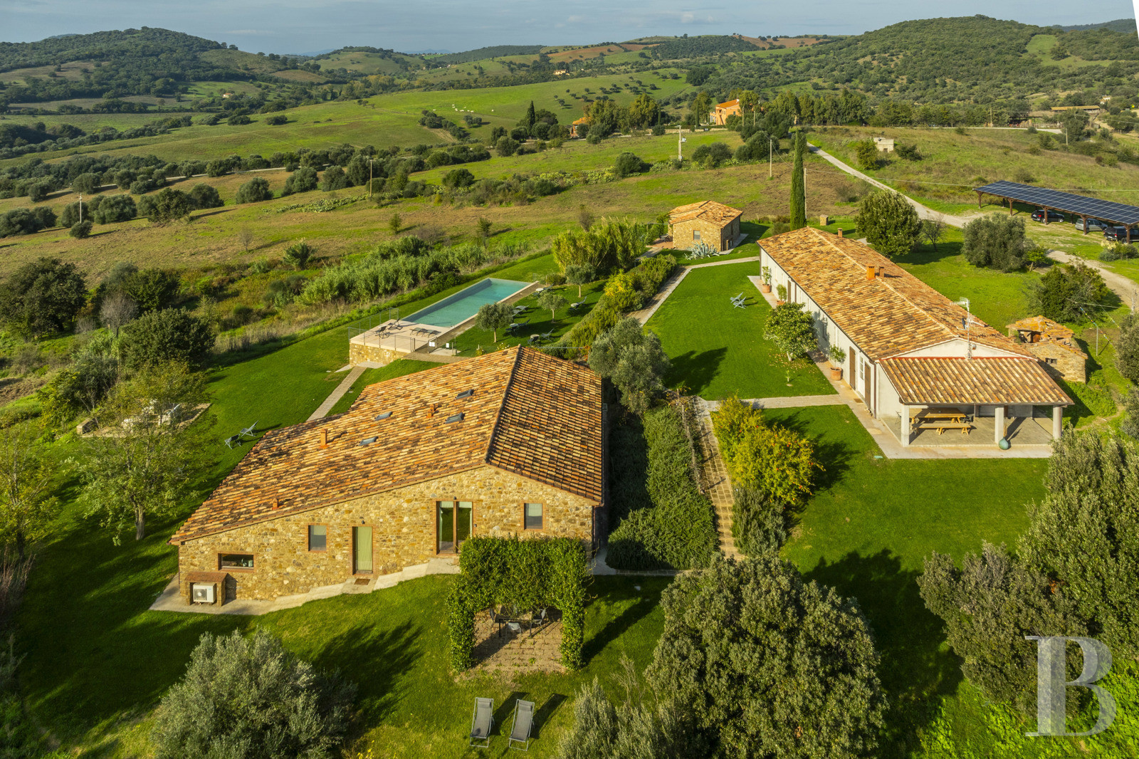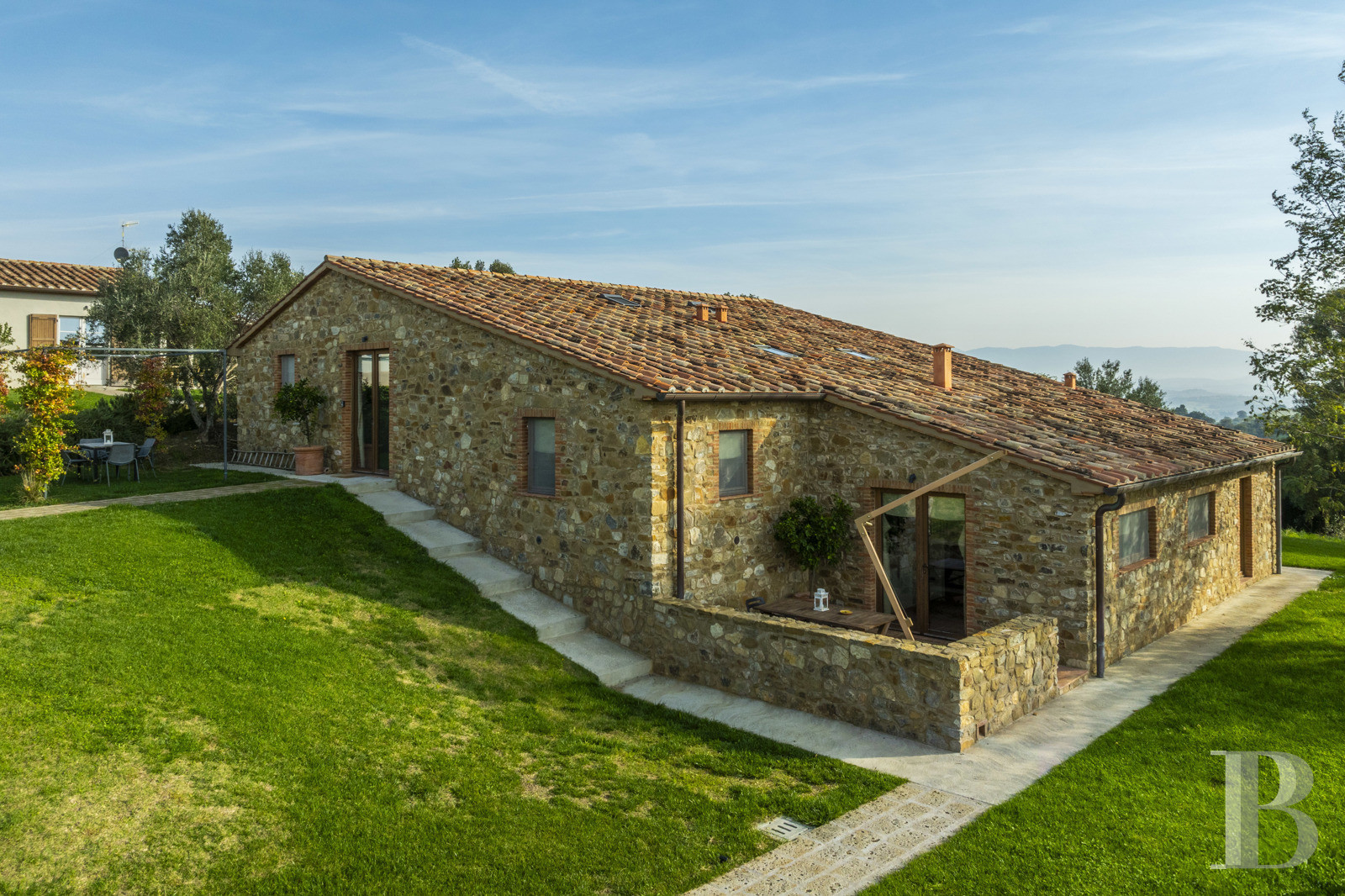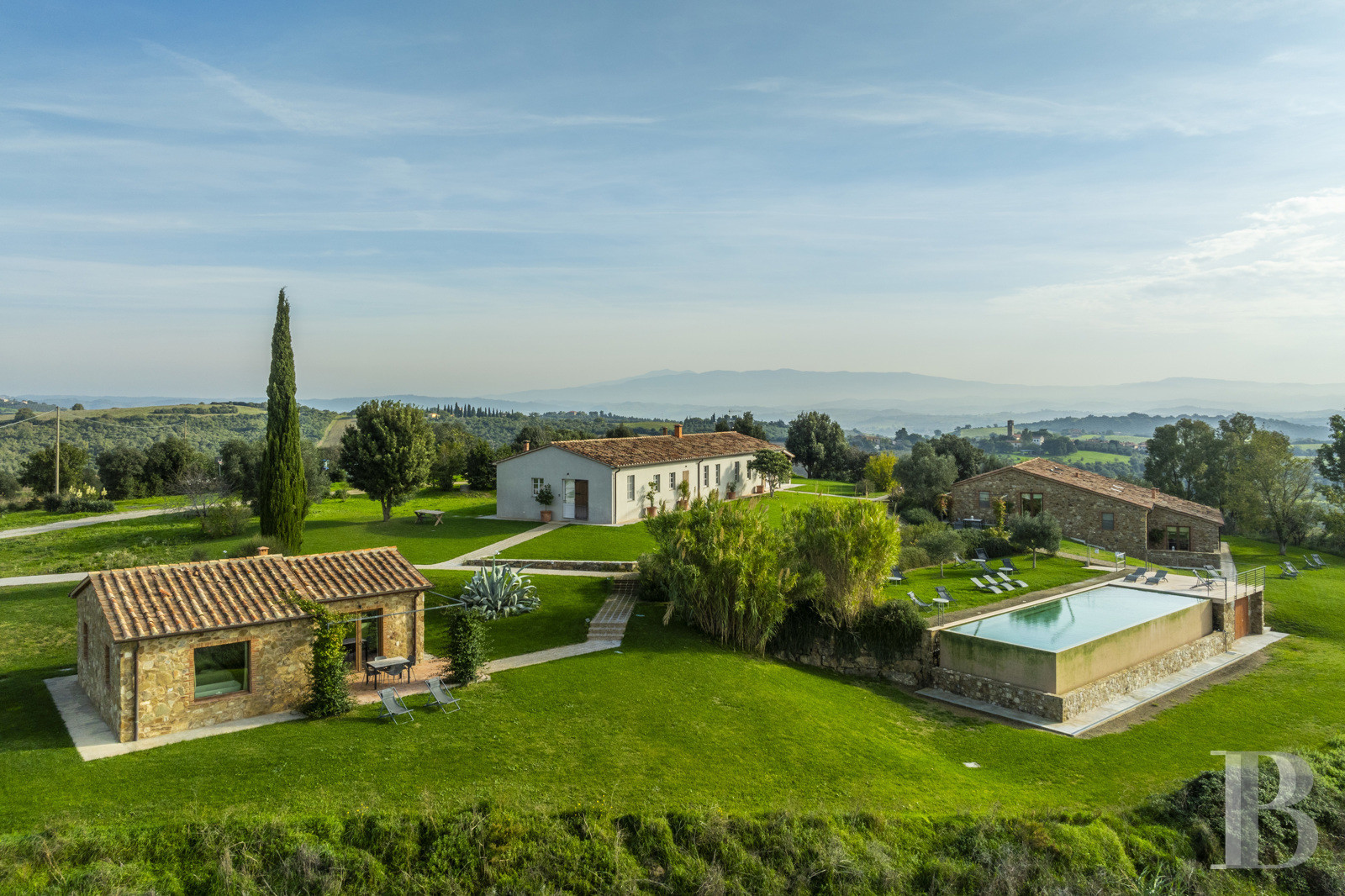a restored Tuscan residence set on forty-three hectares with olive groves and stone outbuildings.
