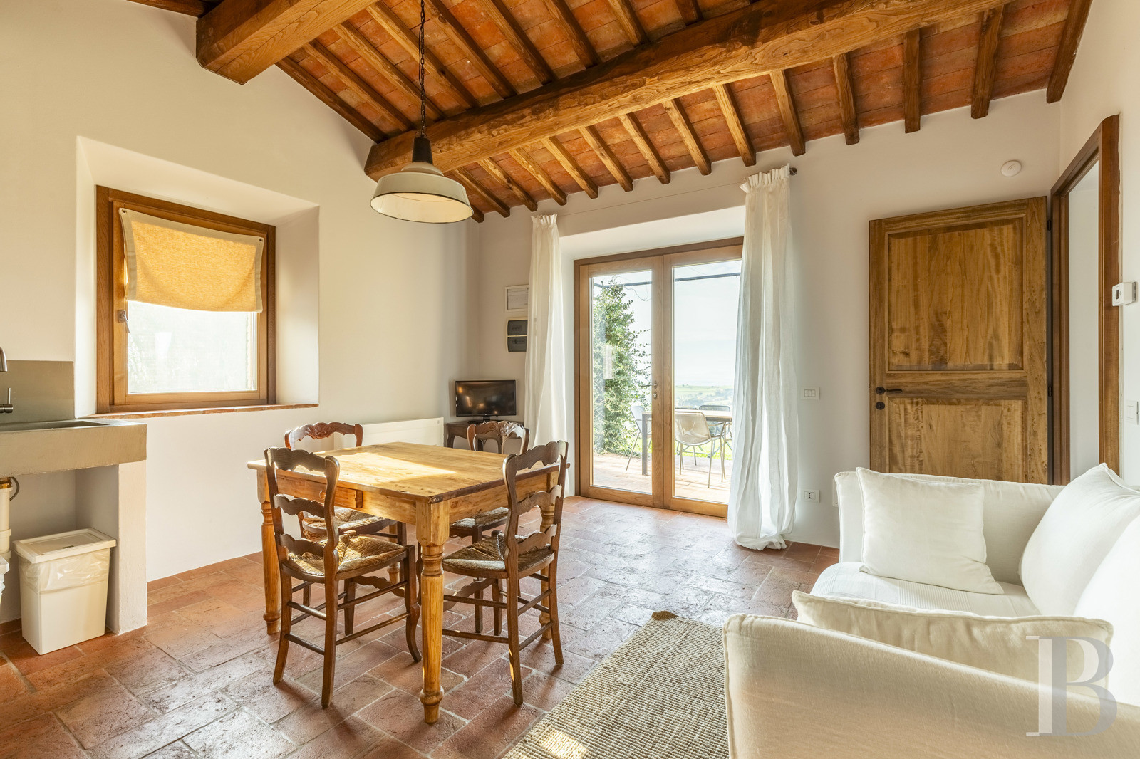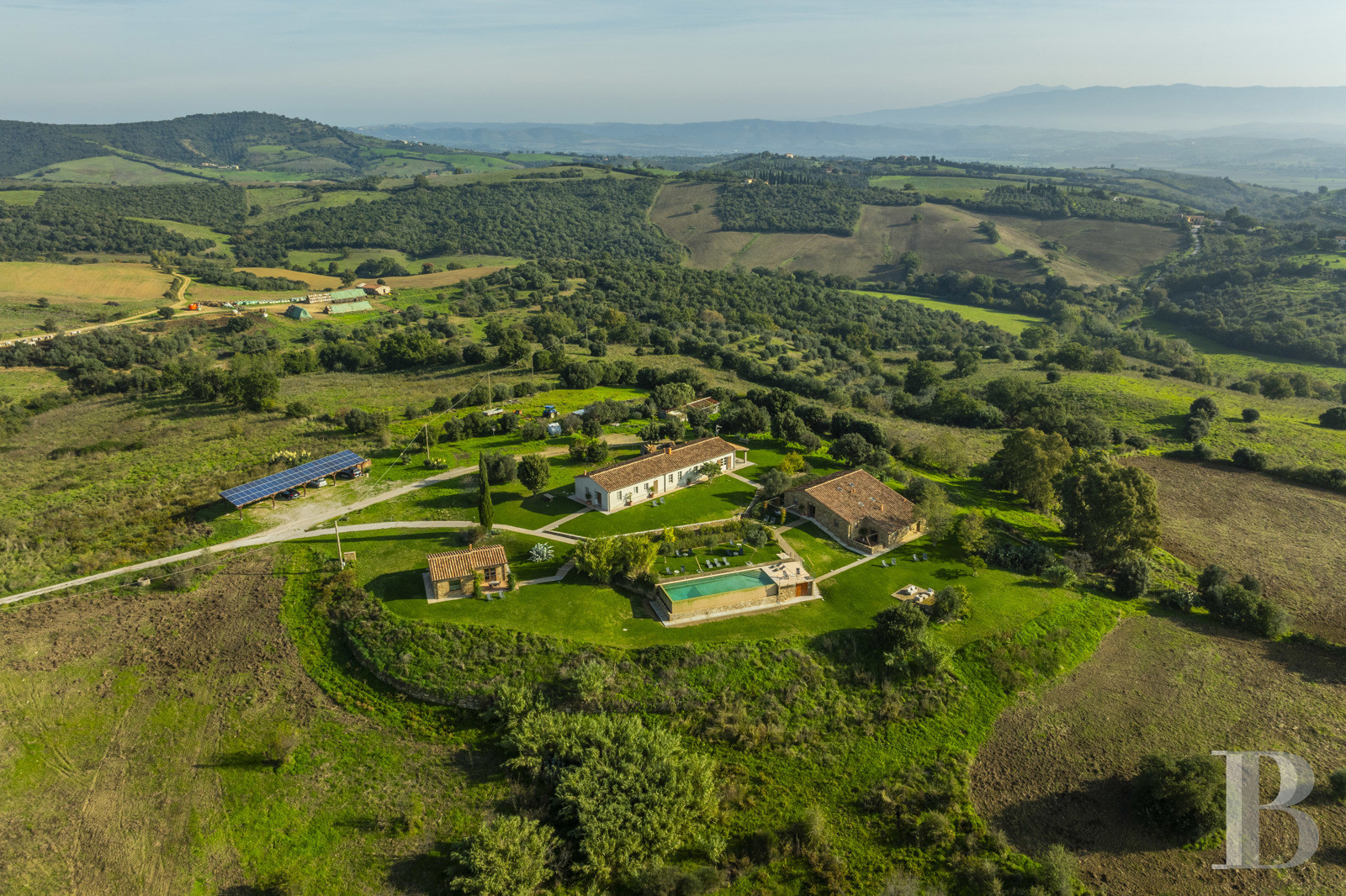 A farm that retains its primary function, located in the hills above Campagnatico. Forty-three hectares of land where five hundred olive trees continue their cycle, joined by a certified organic vegetable garden. The main house is over five hundred square metres in size, with a simple layout. Around it, four renovated stone buildings offer simple, fully equipped self-contained accommodation. The whole property is easily accessible. A functional property, serving as both a country residence and potential accommodation facility.