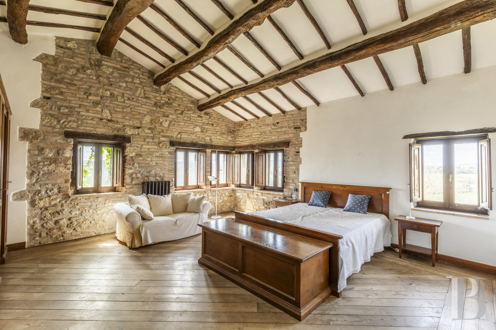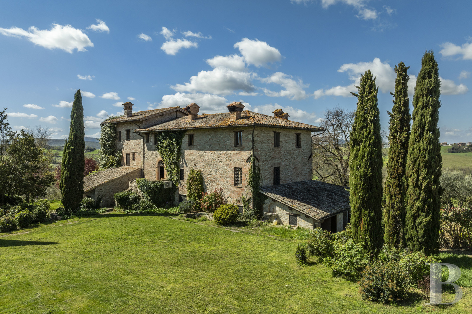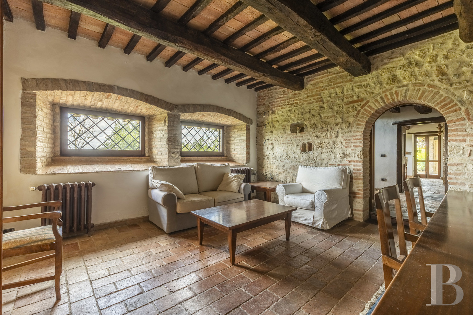 Some residences bear witness to several successive lives. This one is a powerful example. Built in the 13th century as a watchtower on the Umbrian hills, it still watches over the rolling landscape, between vineyards and olive groves. Its restoration respects the traces of time: terracotta vaults, exposed stone that interacts with the light. The reception areas occupy the ground floor, where the windows frame views of the countryside. The bedrooms are spread over the upper floors, each one imbued with the thickness of the walls and the patina of the original materials. A separate annex completes the estate. The swimming pool blends into the landscape, a natural extension of the terraces. The grounds extend over several hectares, alternating between olive groves, meadows and ancient woods. The region, rich in gastronomic and wine-growing heritage, lends itself equally well to the intimacy of a residence and to hospitality. The art cities of central Italy remain within easy reach. Between medieval memories and contemporary installations, the residence awaits an attentive eye so that its stones can continue to tell their story. Its unique character gives it the qualities necessary for its transmission to hands that respect its history.