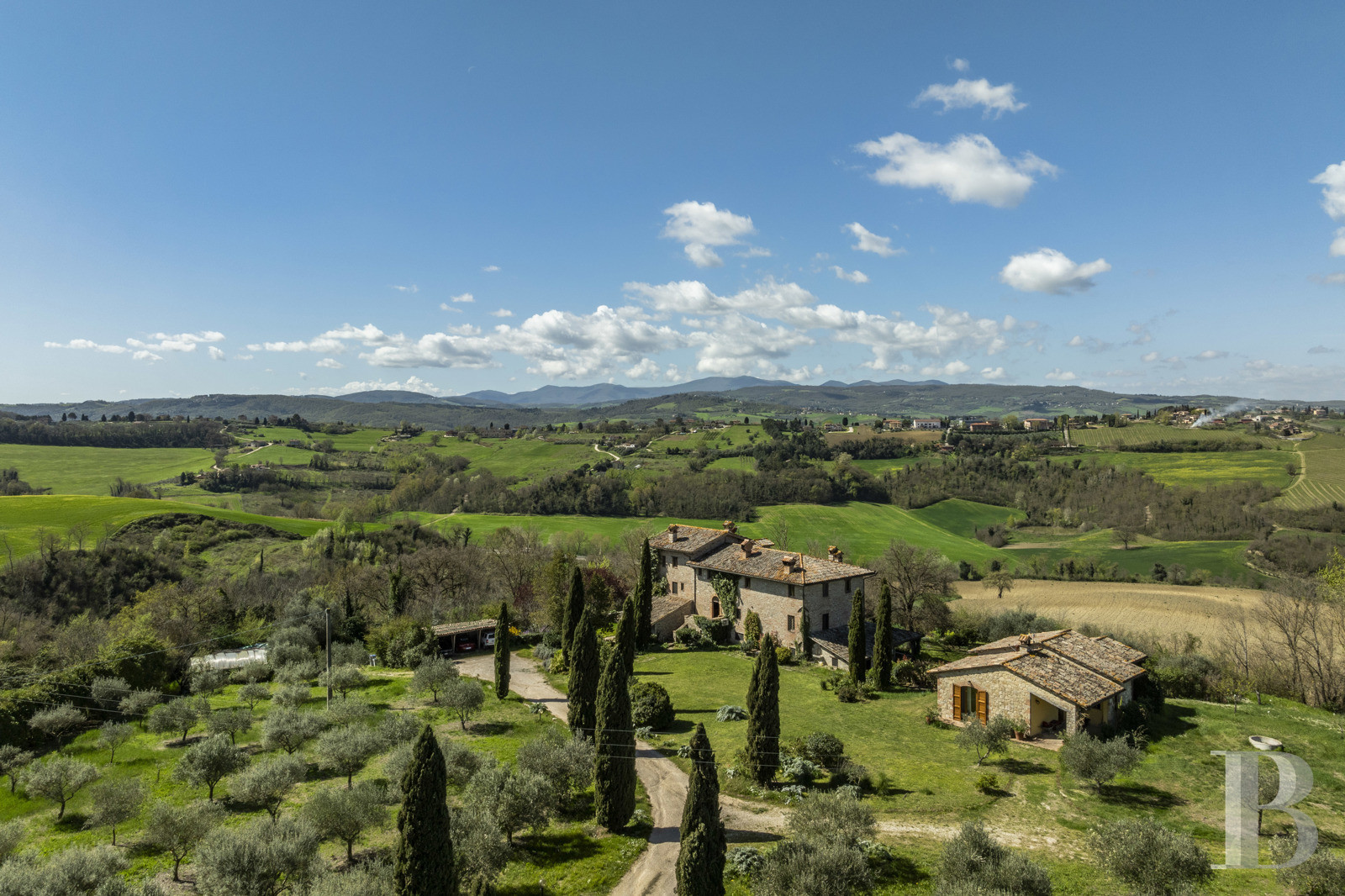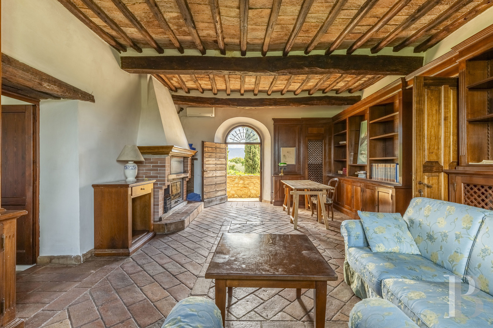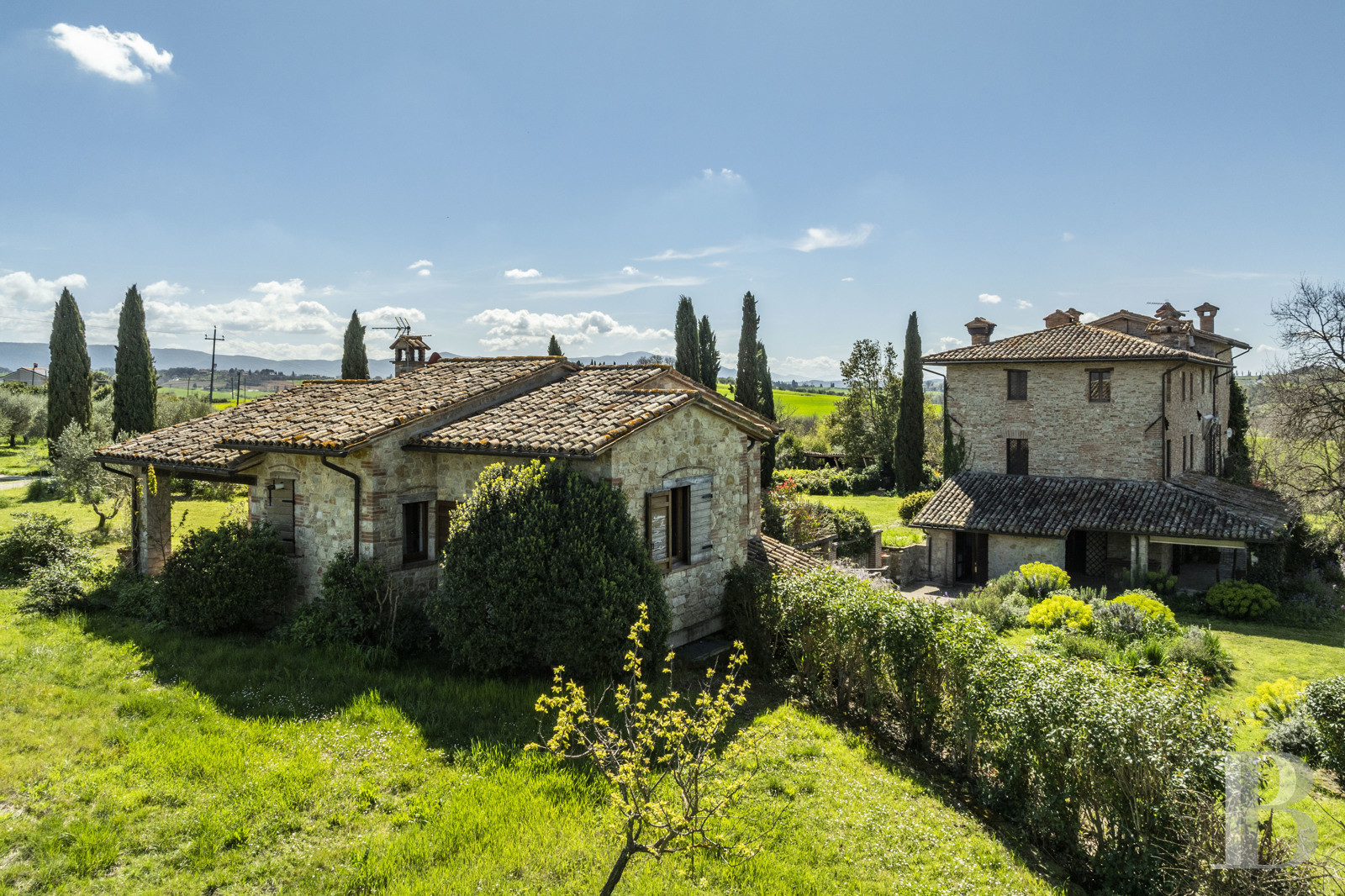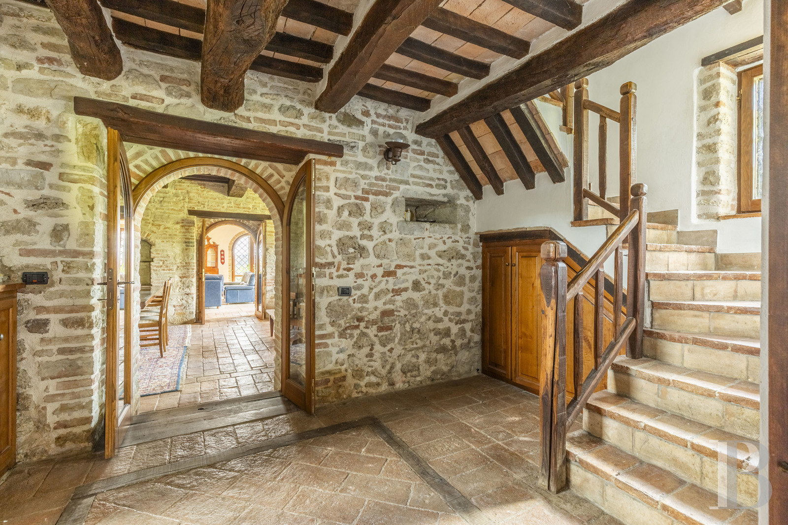 Some residences bear witness to several successive lives. This one is a powerful example. Built in the 13th century as a watchtower on the Umbrian hills, it still watches over the rolling landscape, between vineyards and olive groves. Its restoration respects the traces of time: terracotta vaults, exposed stone that interacts with the light. The reception areas occupy the ground floor, where the windows frame views of the countryside. The bedrooms are spread over the upper floors, each one imbued with the thickness of the walls and the patina of the original materials. A separate annex completes the estate. The swimming pool blends into the landscape, a natural extension of the terraces. The grounds extend over several hectares, alternating between olive groves, meadows and ancient woods. The region, rich in gastronomic and wine-growing heritage, lends itself equally well to the intimacy of a residence and to hospitality. The art cities of central Italy remain within easy reach. Between medieval memories and contemporary installations, the residence awaits an attentive eye so that its stones can continue to tell their story. Its unique character gives it the qualities necessary for its transmission to hands that respect its history.
