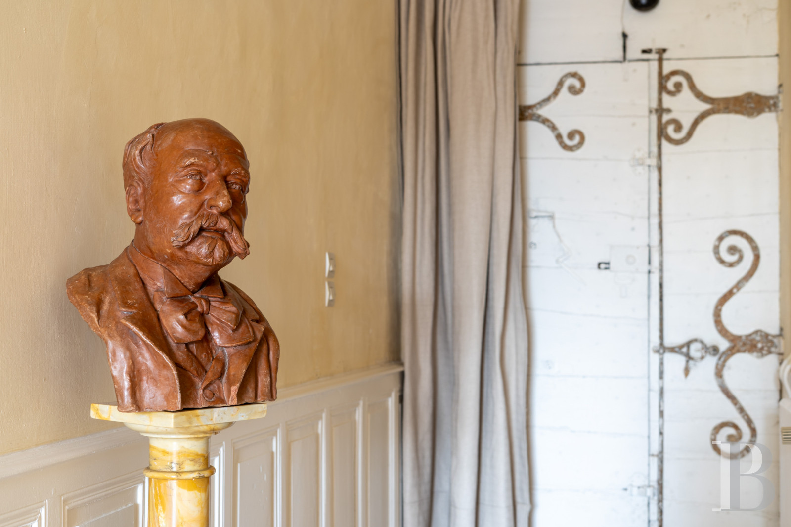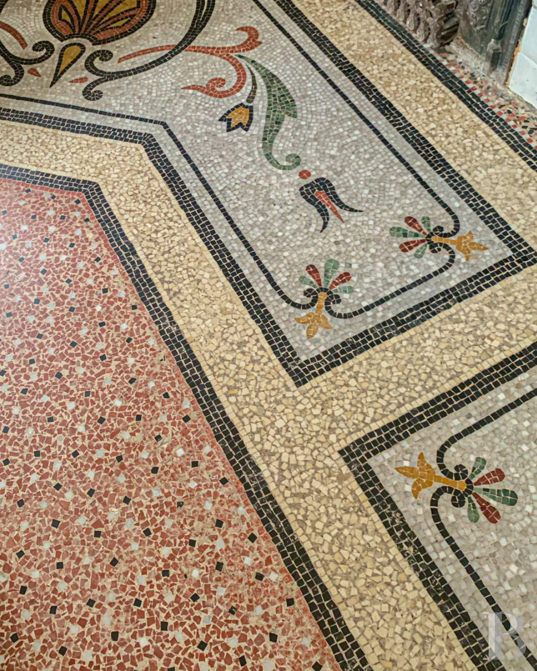 Located to the south, the dwelling’s oak front door, which still features its original metal hinges and whose warm tones elegantly contrast with the dwelling’s stone façade, opens on to a foyer with a terrazzo marble floor that traverses the dwelling all the way to the garden on the other side. As the house’s backbone, this initial room provides access to a small sitting room and a dining room, which illustrates the sumptuous Second Empire period, whereas the dining room’s sculpted white marble fireplace, woodwork decorated with trumeau panels depicting pastoral scenes, and wide limestone floor tiles also illustrate the opulence of this house’s past.
