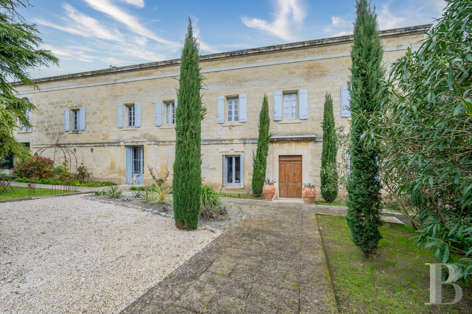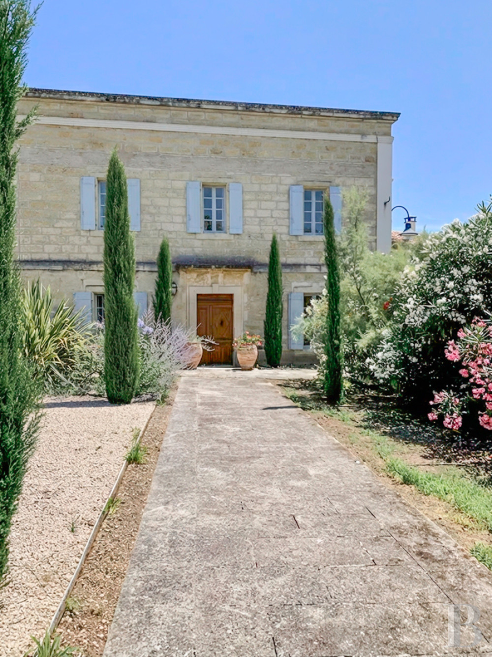 Built along a northwest/southeast axis, the L-shaped edifice was designed with a rectangular main building facing east, whereas the architectural complex extends over nearly 500 m² and boasts a minimalist façade with uniformly coursed ashlar stone masonry. As for the blond ochre-colour limestone, it was probably extracted from the nearby Pondres quarry, while the two-storey dwelling is cadenced by 11 rectangular windows/doors, including three evenly spaced glass double doors.