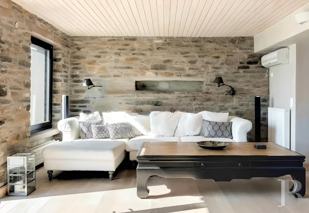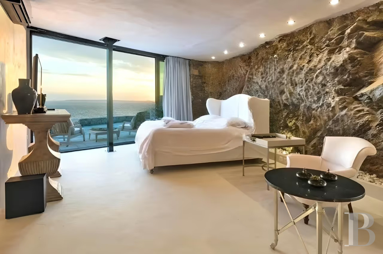 A harmonious blend of buildings and landscaping, with multiple outdoor living spaces on the terrace side organised around the curved saltwater pool that echoes the sea, and on the cliff side, stone, wood and rock architecture that blends discreetly into its rocky surroundings while majestically dominating the views of the Aegean Sea and Mediterranean sunsets. A particularly inspiring place for lovers of architecture, set in an ideal location for extended Greek summers or getaways from Athens.