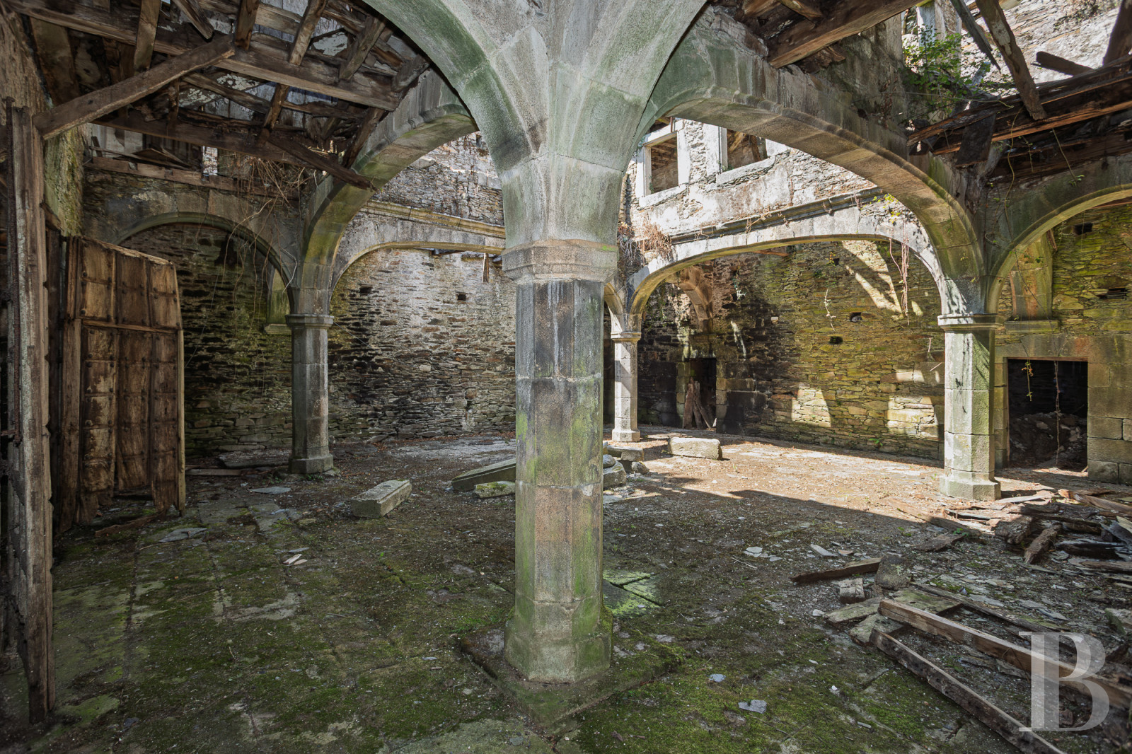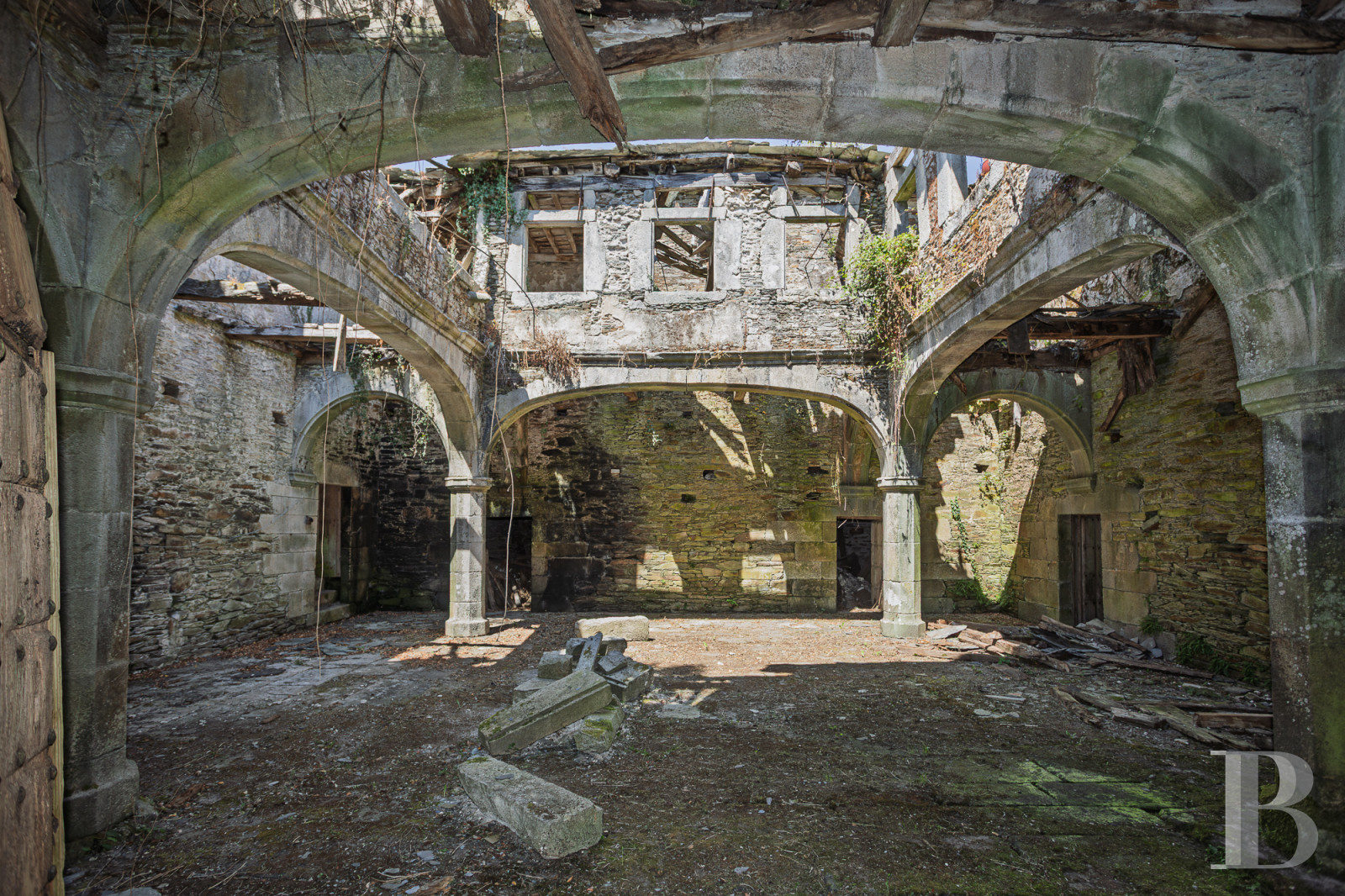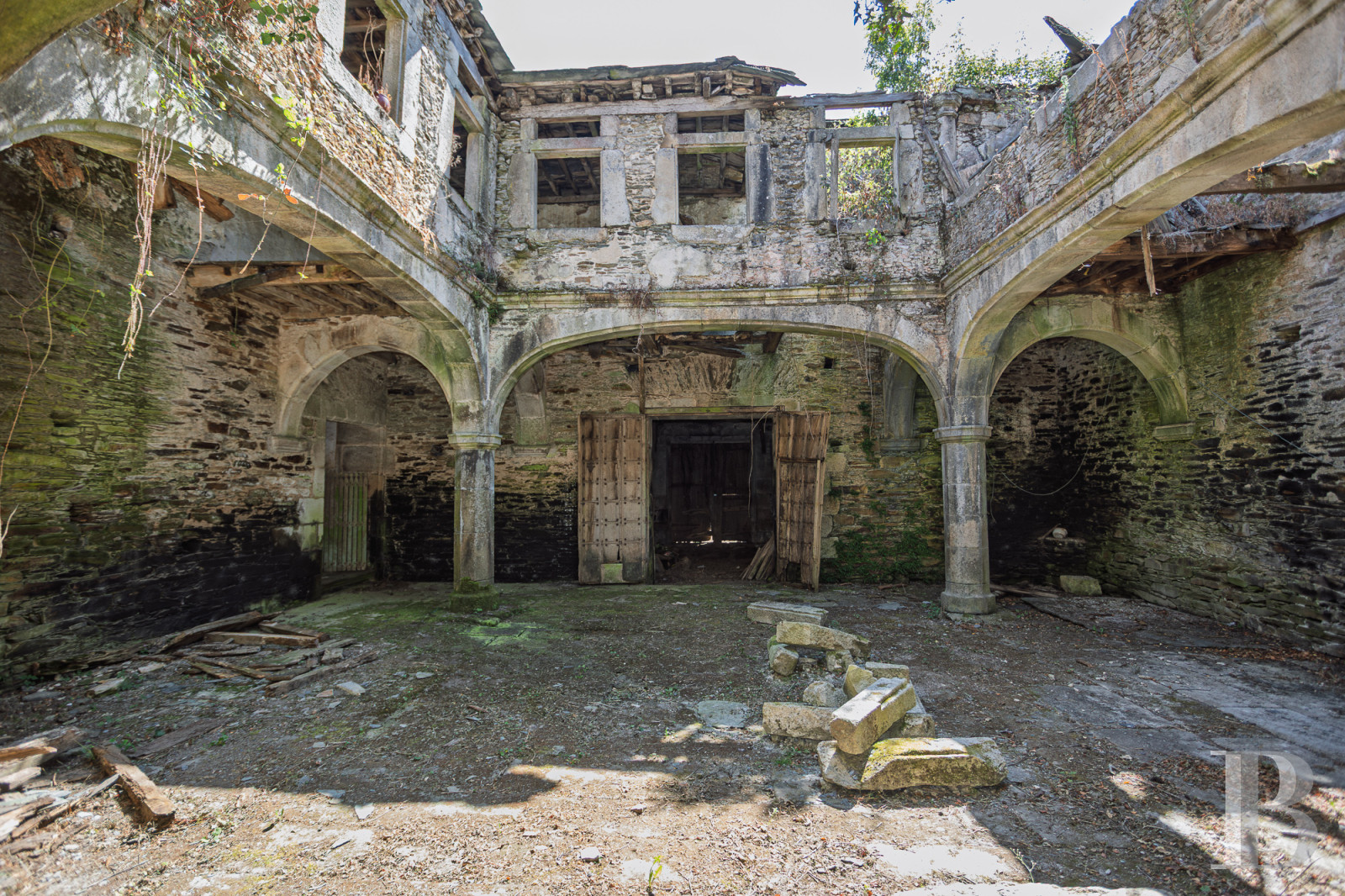 The first references to this stately home date back to 1660, when the estate belonged to the powerful Osorio-Santiso family. The coats of arms carved in stone, crowned with noble insignia, bear witness to a history of battles and Galician lordships. The main pazo, measuring approximately 2,000 m², features a 200 m² interior courtyard surrounded by exceptionally graceful stone arcades. Although in need of complete restoration, the stone walls remain solid and the original features are waiting to be restored to their former glory. A second modern dwelling, a stone wash house and a barn with a traditional oven complete the property, located 23 km from Lugo, a UNESCO World Heritage Site. An architectural heritage where a new chapter of history can be written.